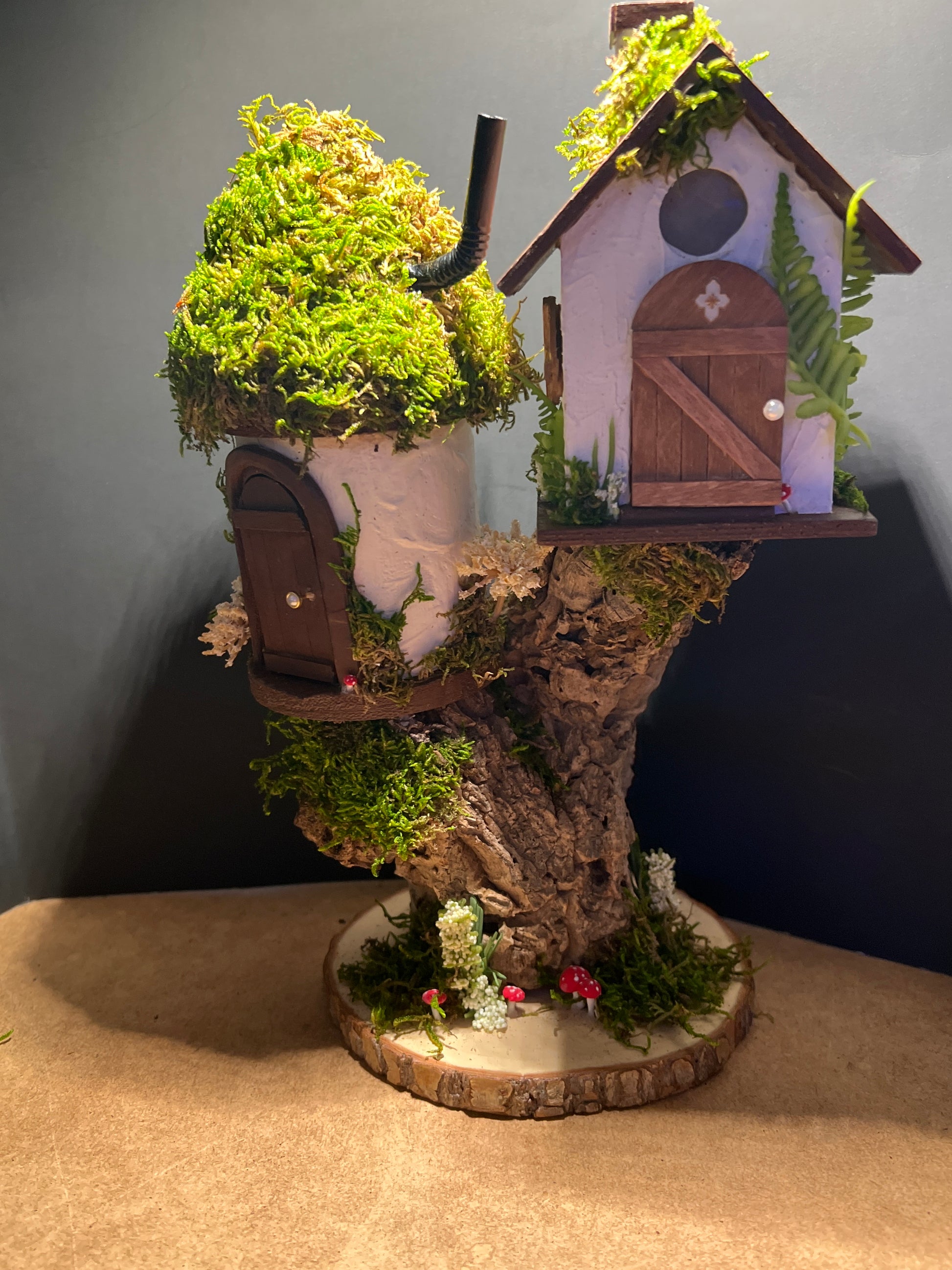 • Upcycled Elements: A clever addition of a black textured tube (resembling a chimney pipe) connects the two structures, adding a touch of "fairy engineering."