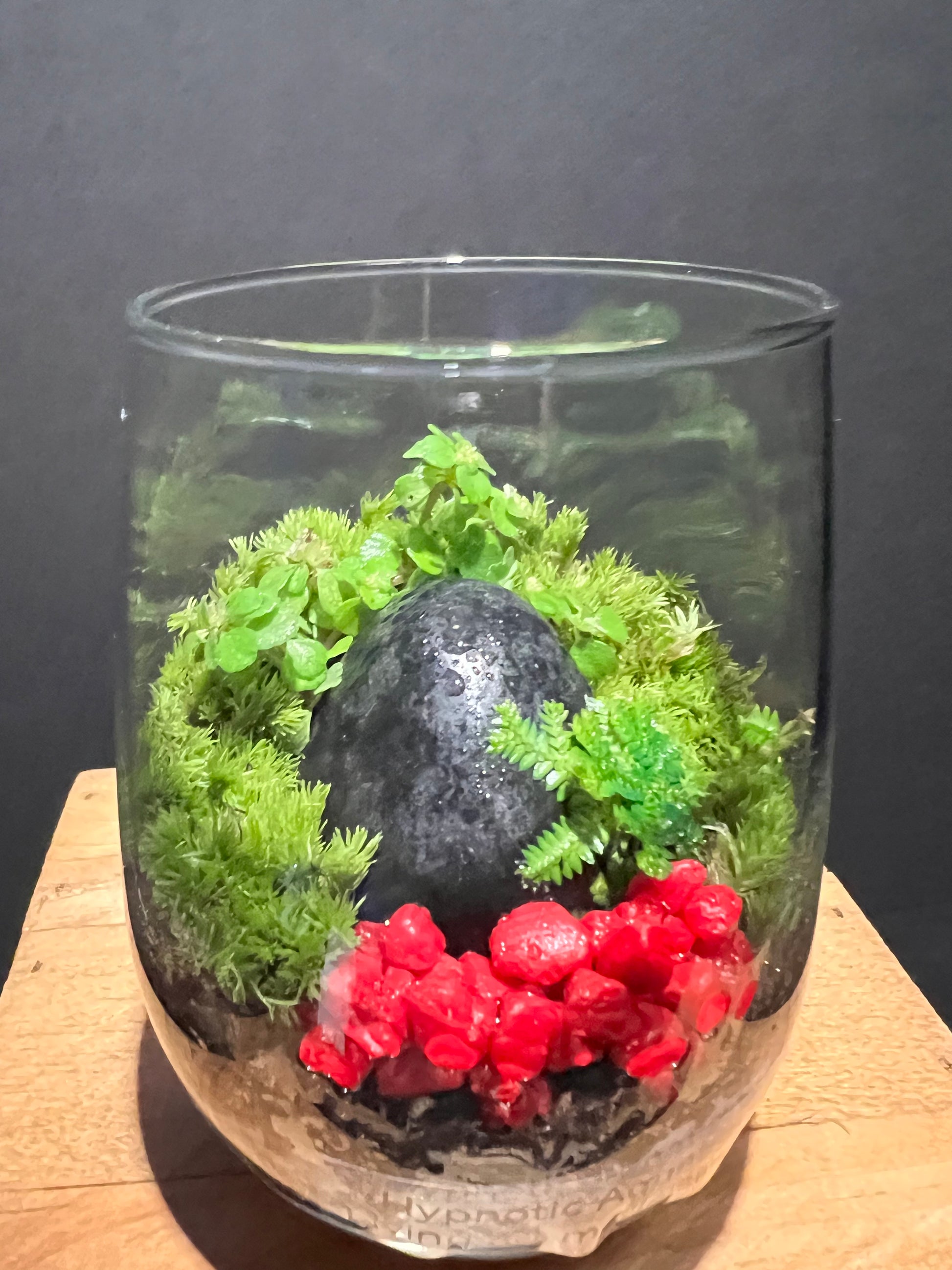 It’s wine time! Polished Beach stone, with Red gravel accent, Peacock Fern, Babies Tears, and Cushion Moss complete this vessel.