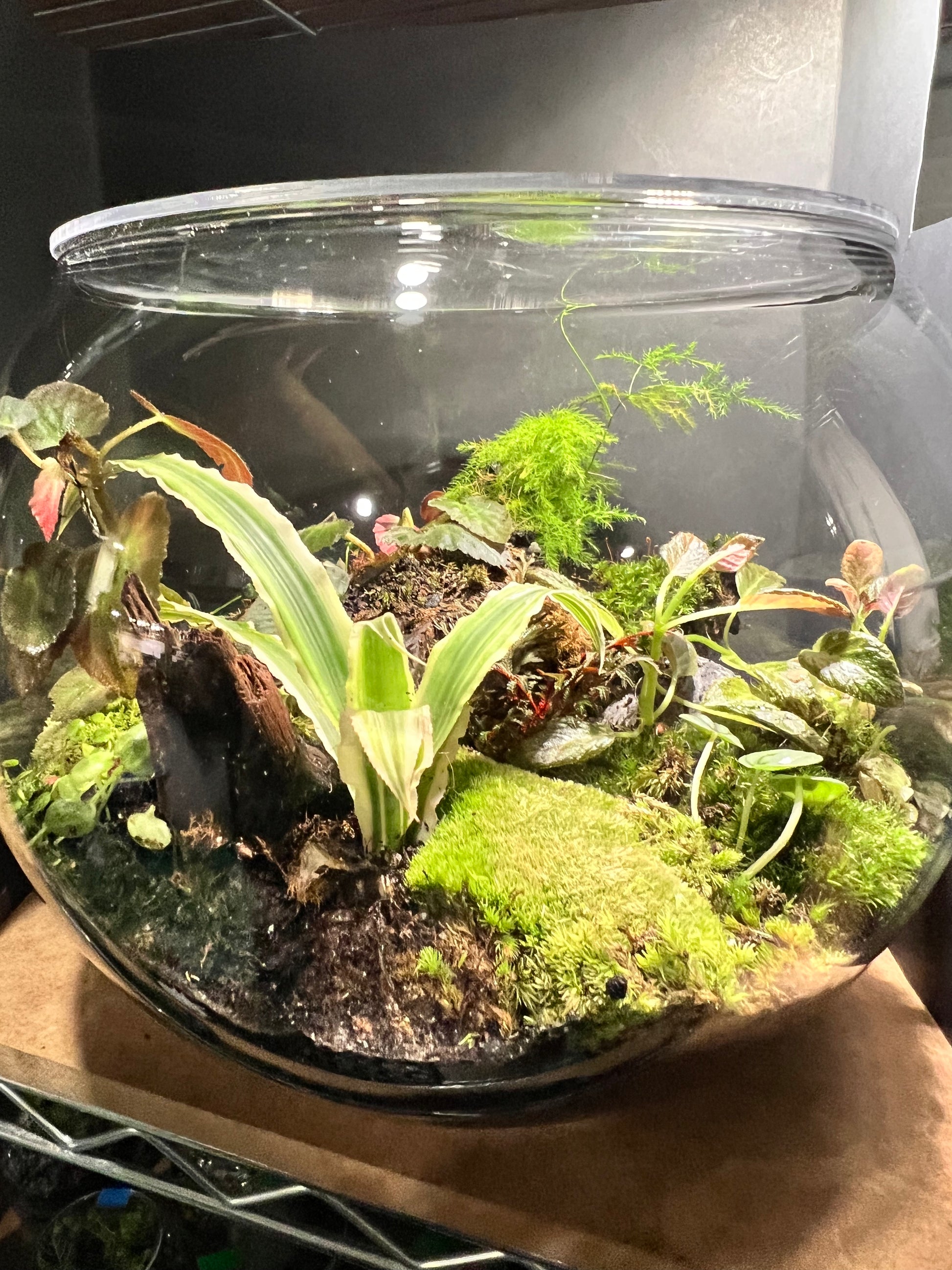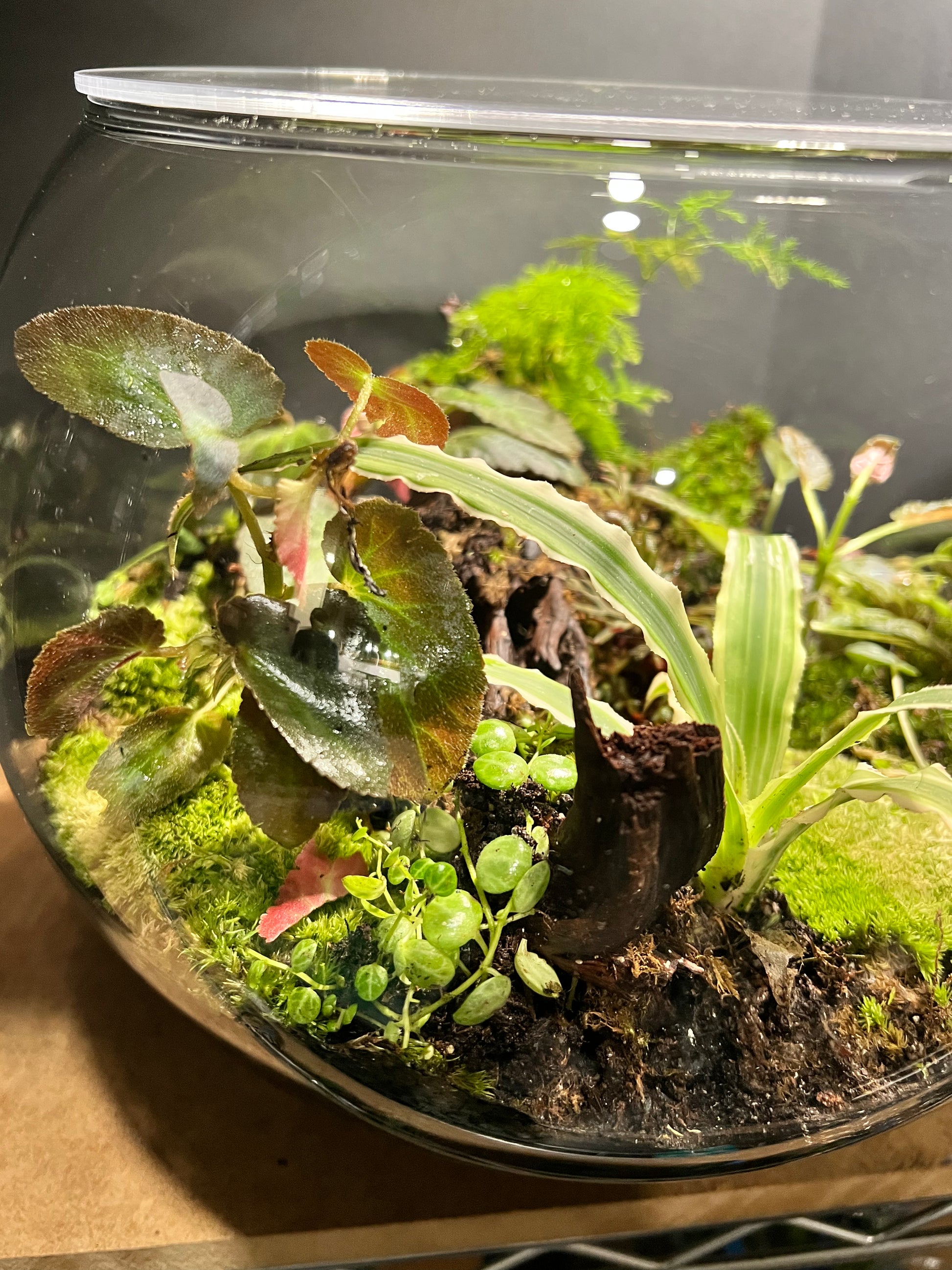 This is a statement piece, starting with the Begonia Brazilian Lady Angel Wings, Variegated Peperomia, Grapevine wood, Cultivated and Wild harvested Cushion Moss, Selaginella, Earth star, String of Turtles, String of Variegated Hearts, Asparagus Fern, and Seiryu stones all on our tropical substrate blend.