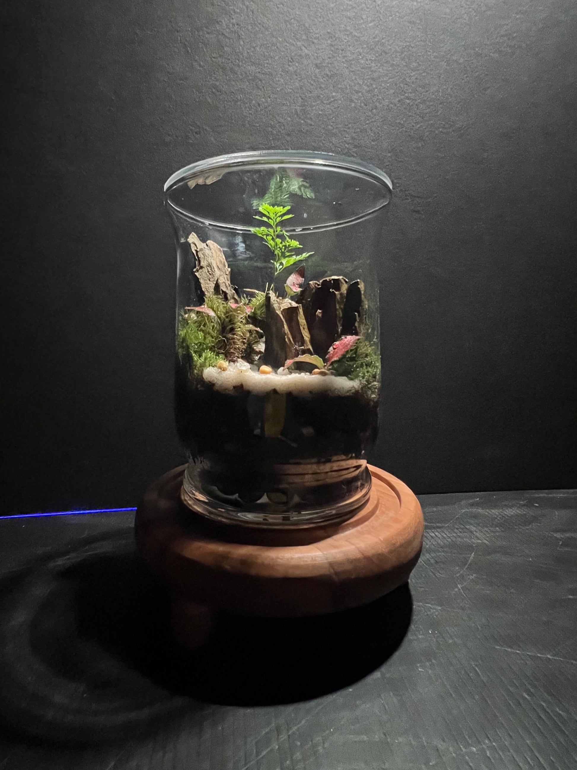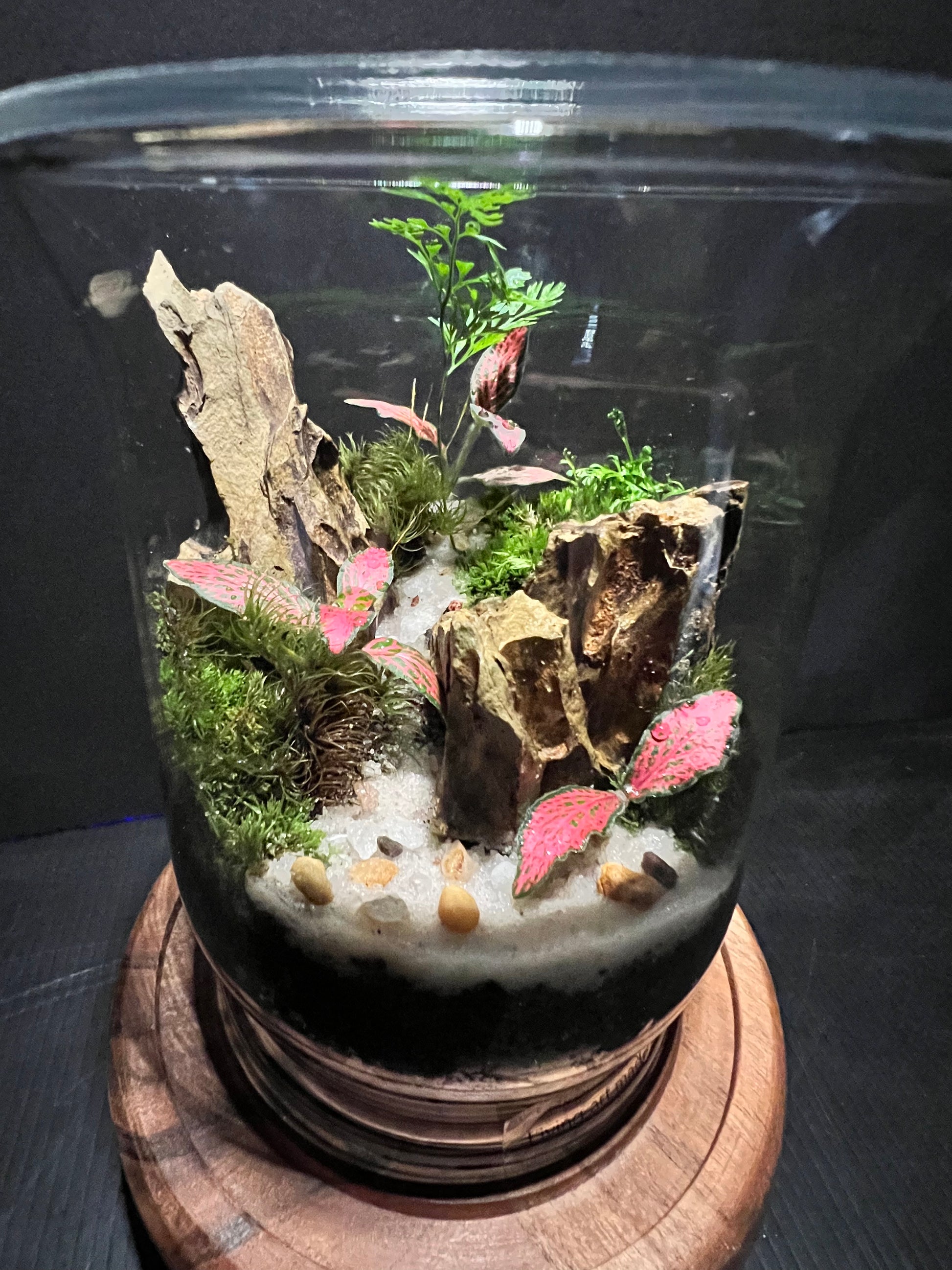 Rabbit’s Foot Fern, Red Fittonia, Cushion Moss, Mood Moss, Dragon stone, Natural gravel and sand are used above our tropical substrate blend.