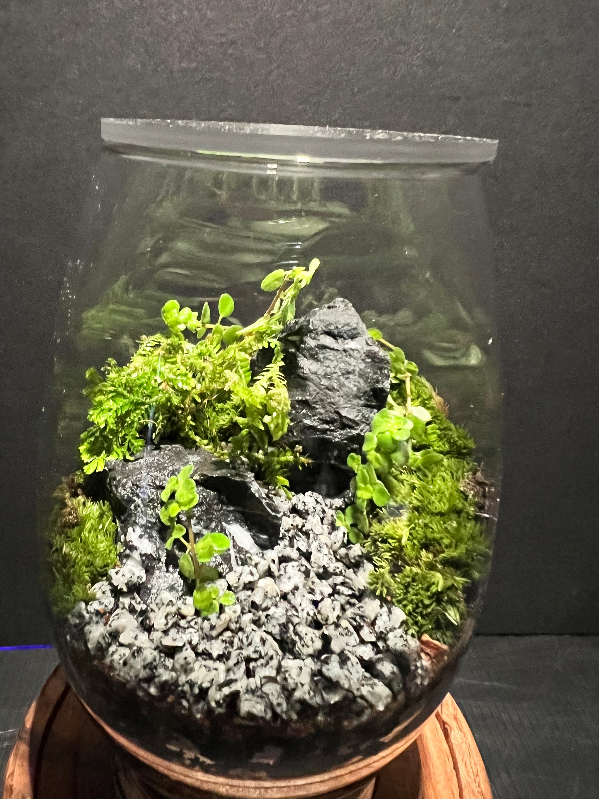 Inside this vase is Selaginella, Baby’s Tears, Cushion Moss, Seiryu stone, Fine gravel, and our tropical substrate blend.