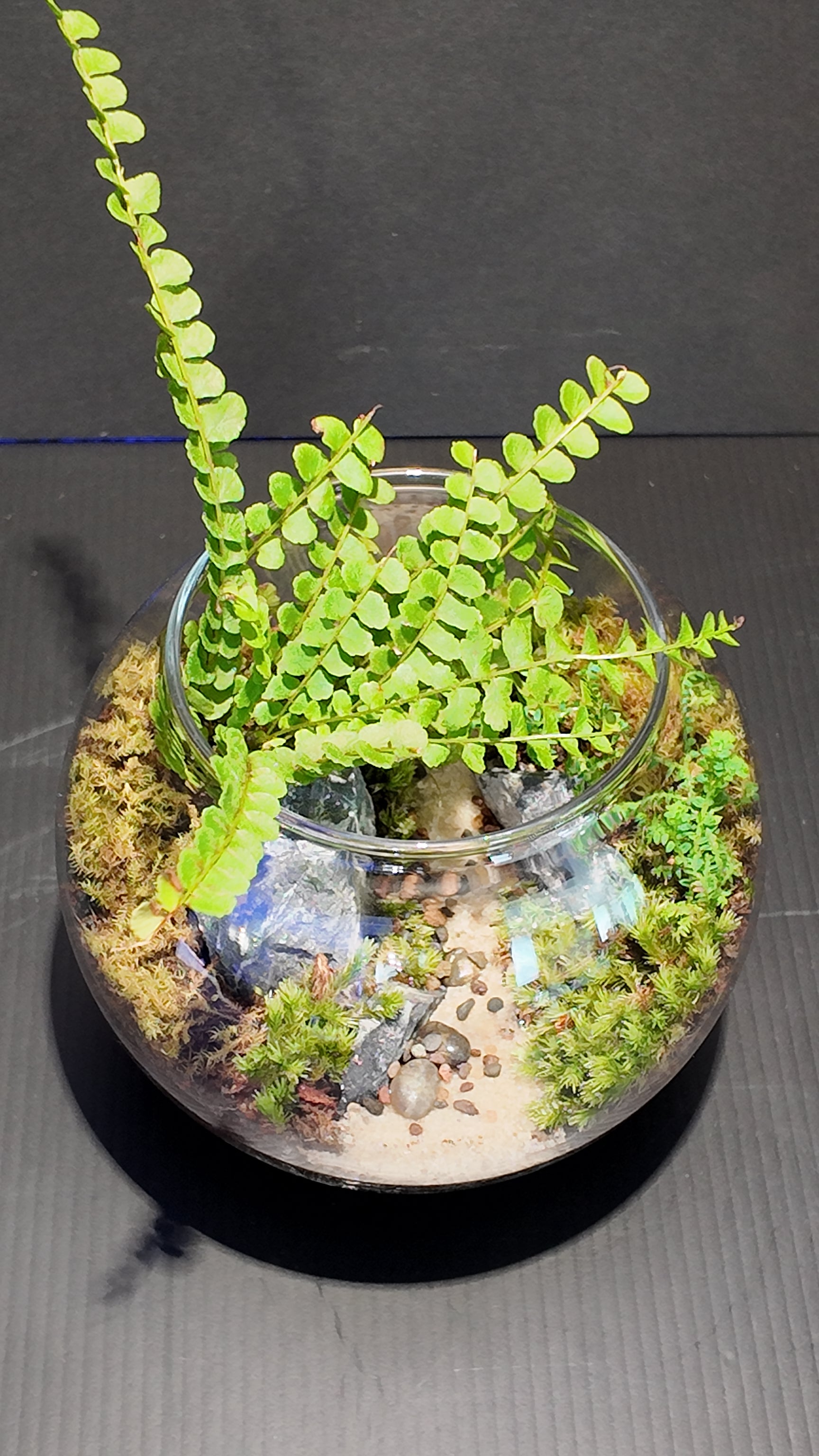 A 5” wide glass bowl contains Lemon Butter Fern, Selaginella Apoda, Star and Cushion Moss complete this terrarium. A pathway of Natural White sand and Seiryu stones balance the center.