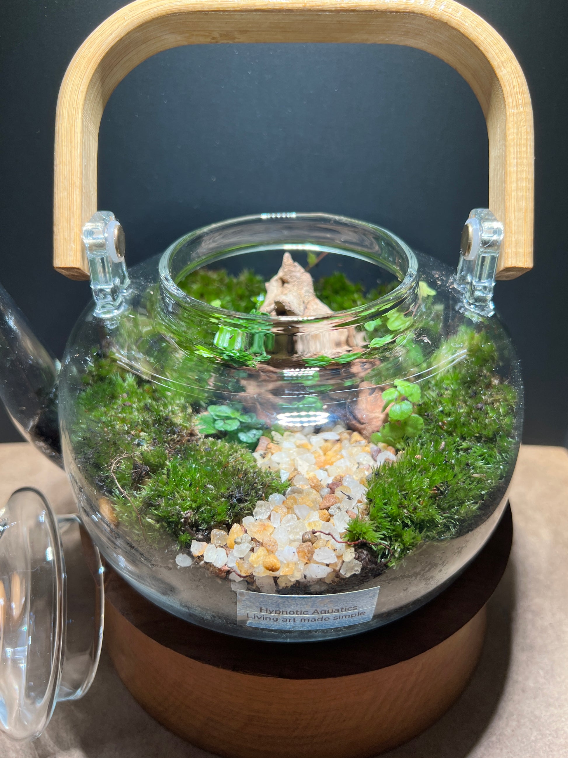 Tea time! Cushion Moss, String of Frogs, Baby’s tears, Small River pebbles, Natural drift wood all complement our substrate blend.