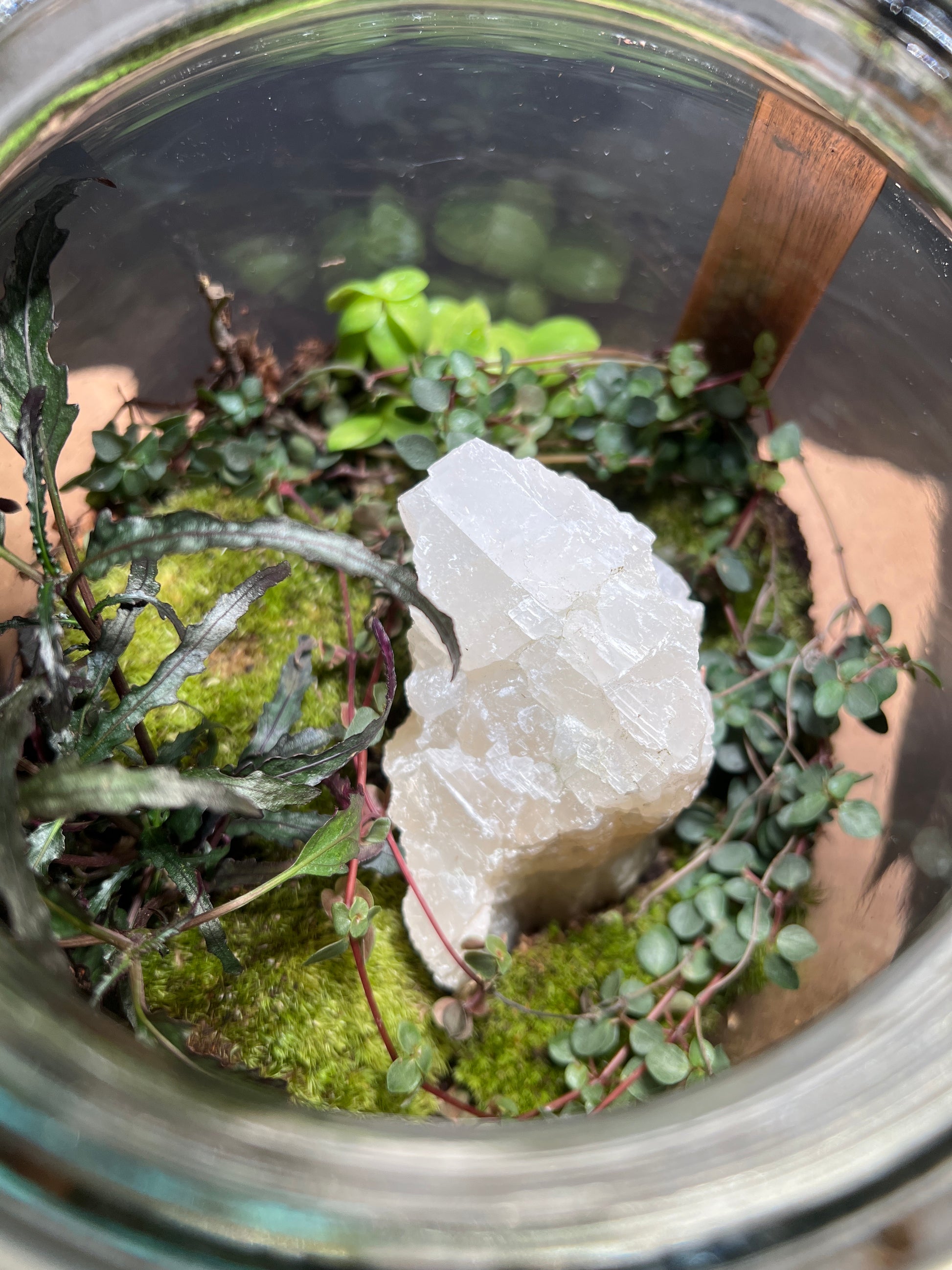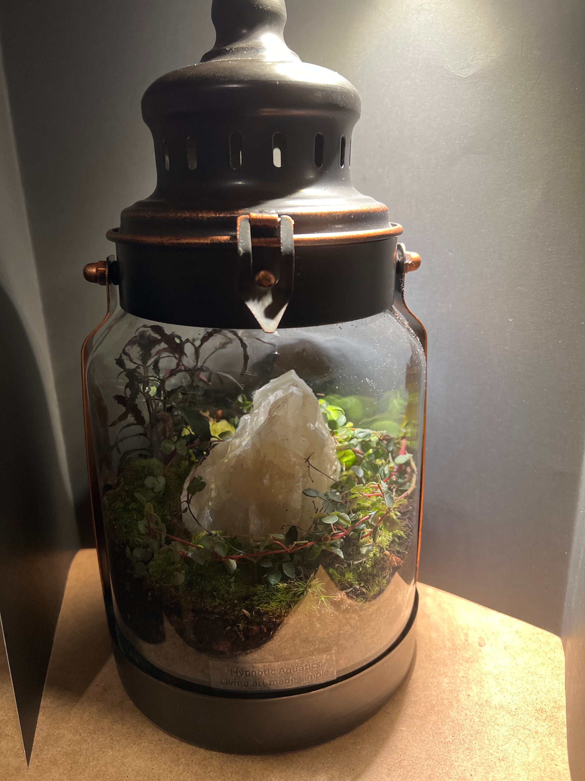 Need a light conversation piece, this will suffice I guess. A large Amber Quartz plays center role, wrapped with Baby’s tears Pilea, a touch of Dragons tongue and a small offering of String of Spades. Cushion Moss plays delightfully around the vessel. Let it be a beacon for you.