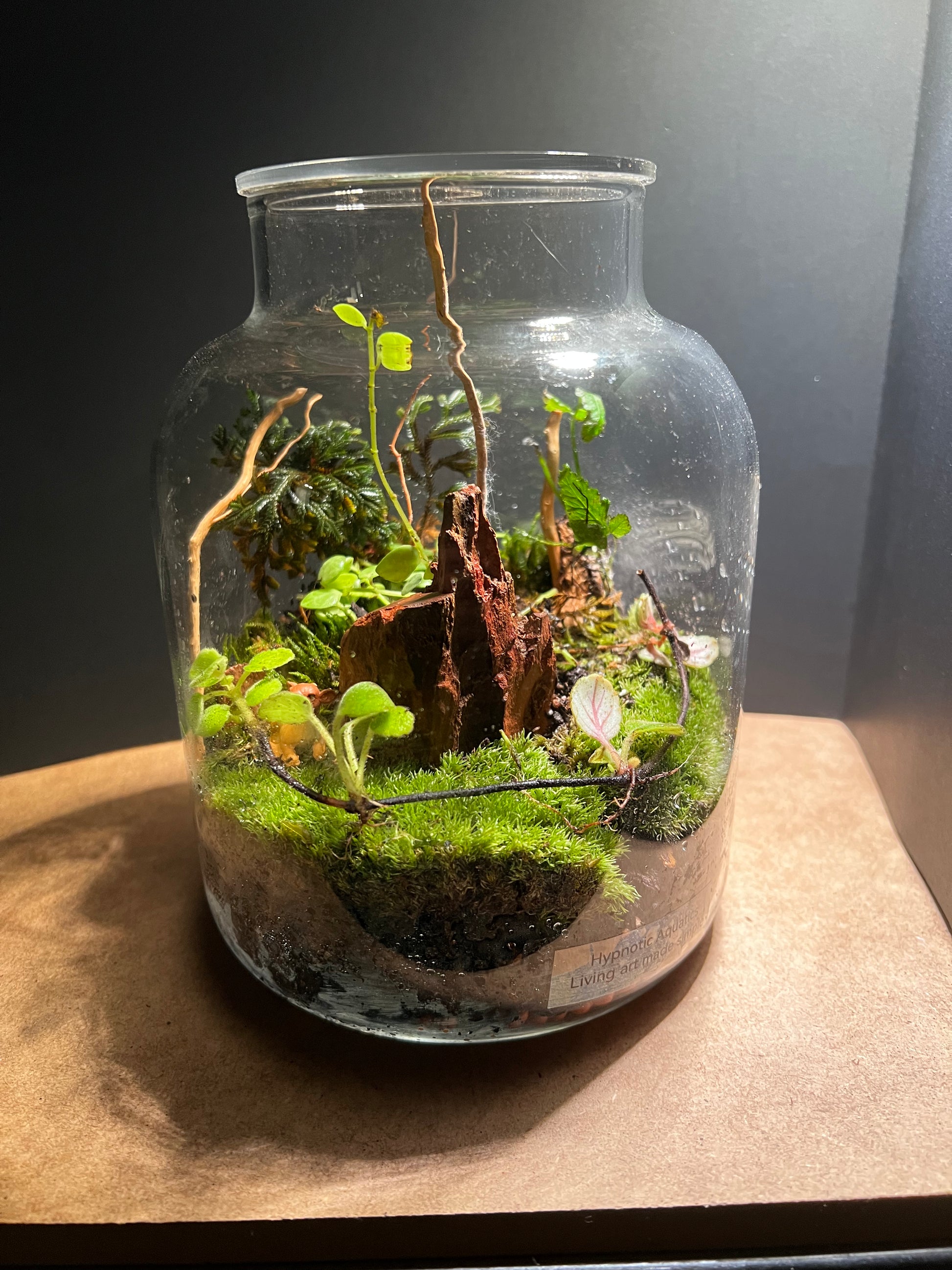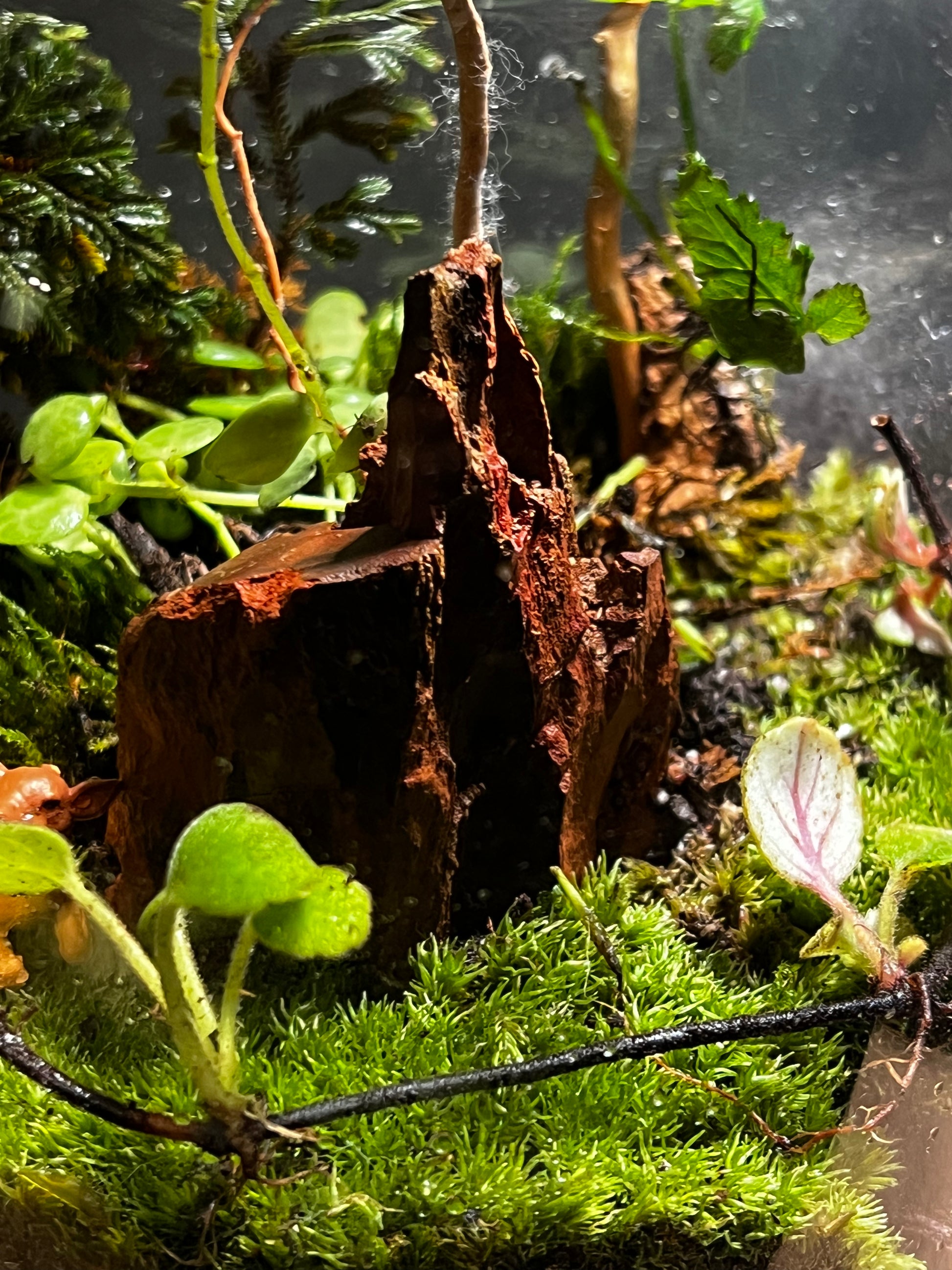 Starting with Selaginella kraussiana, Lace Flower, String of Turtles, Cushion Moss, and then add Dragon stone. Java Fern sits aside on the cork and Carpet Moss is hiding in the back behind the fawn.
