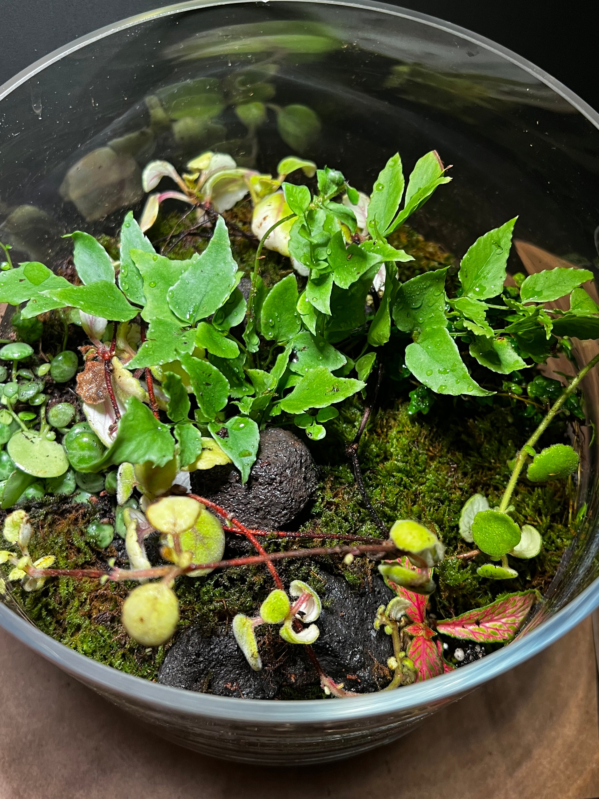 Unique is this vessel’s middle name. Just in at 7” wide with a little wave action in the glass. Japanese Holly Fern takes center with Black lava rock galore in the hillside. String of Turtles to the left, String of Frogs on the right. Lace Flower takes the backseat but spreads out like she owns the place. A single Pink Fittonia sits front. Tree apron Moss and our our tropical substrate blend completes the terrarium.