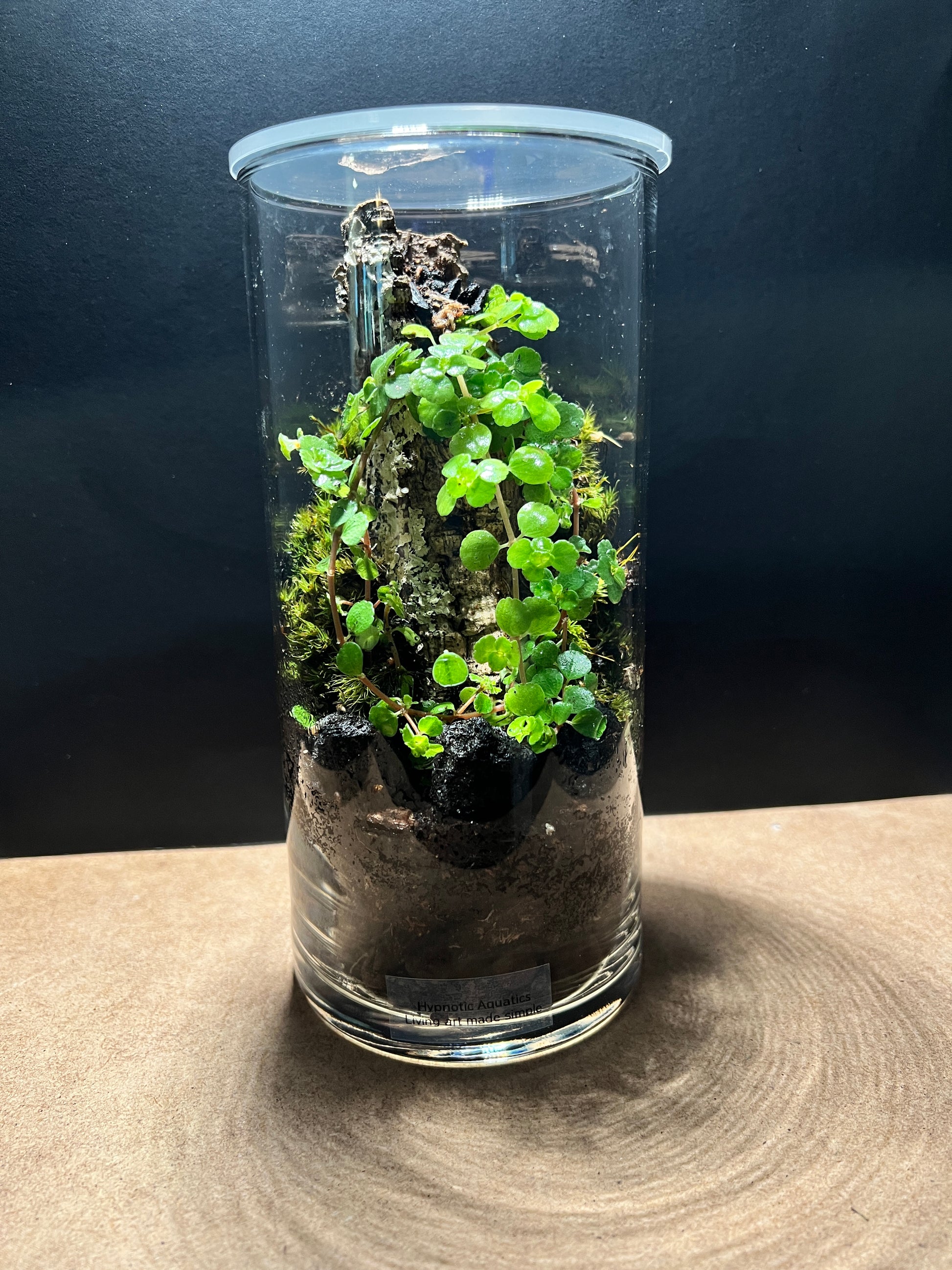 Rock cap Moss, Baby’s tears, Lava rock and Cork bark complete this vessel, with our substrate blend below.