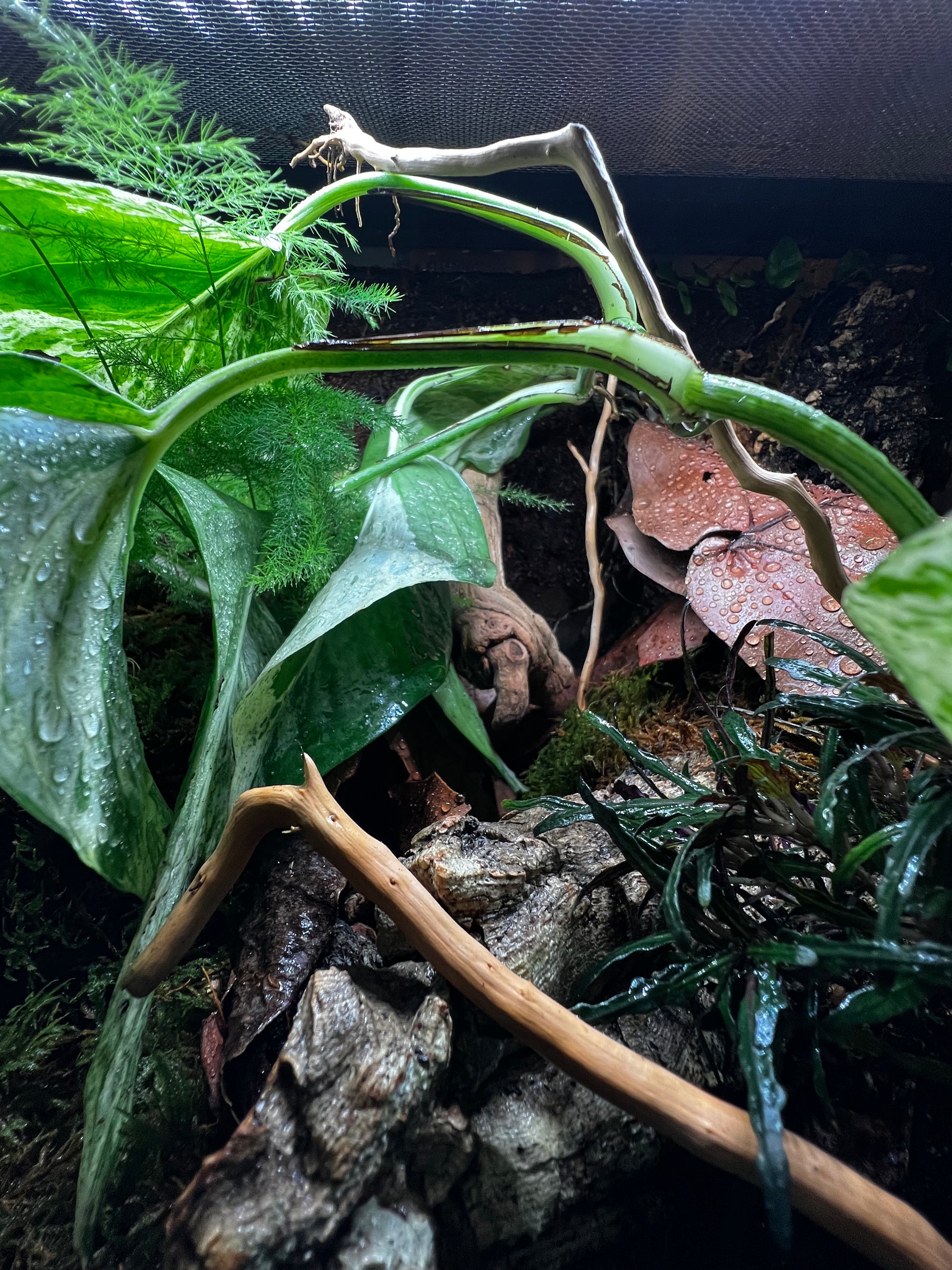 Sub to Tropical decor and plants with two hides within. Measurements are 20” L x 10.5 D x 12” H. Locked screen on top and lock for front doors for easy access and feeding. Build date of Aug 22, 2025. Critter Litter leaf litter with our special substrate blend within to make the 4” of hiding.