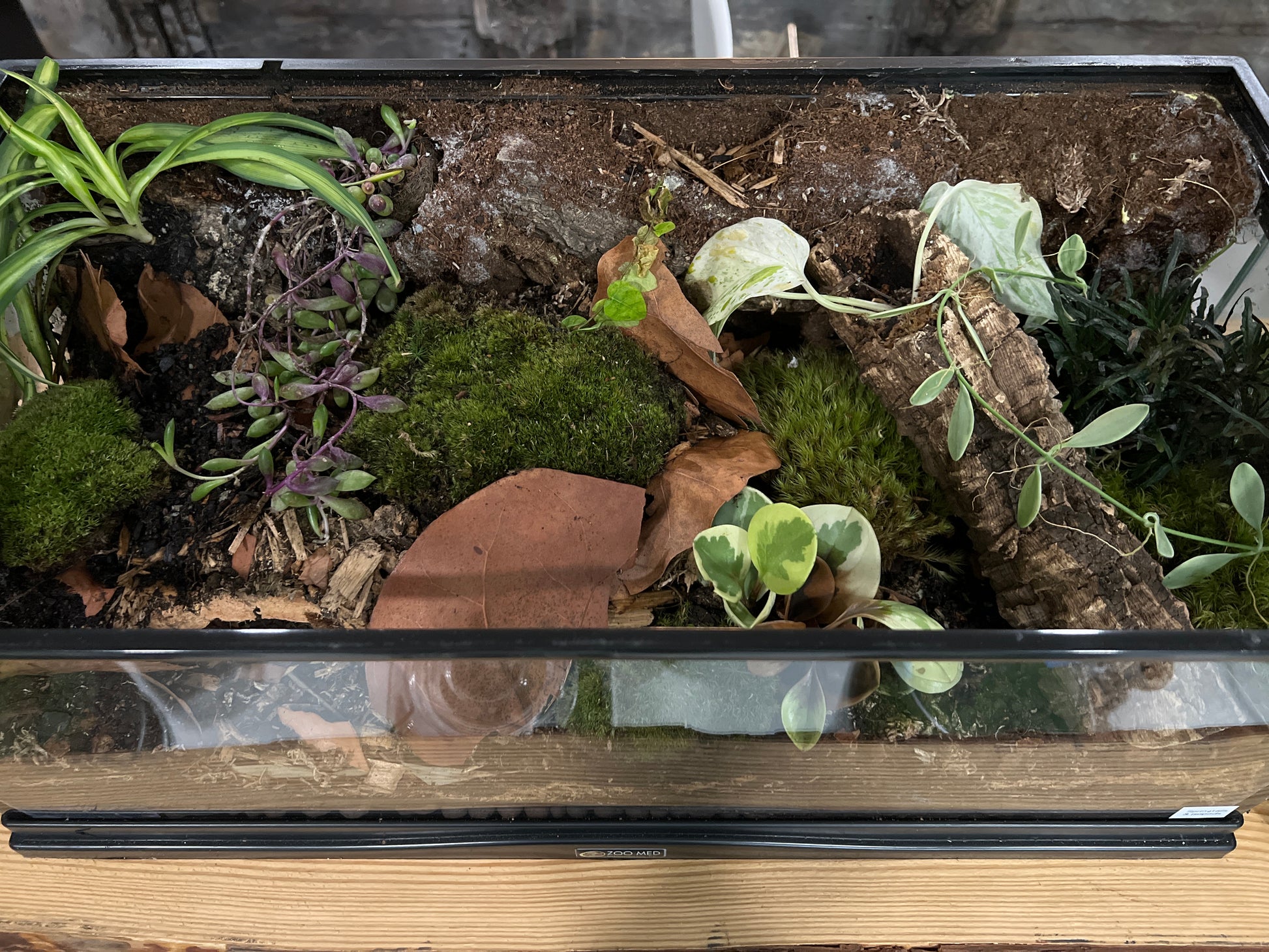 This special habitat built for a terrestrial friend with a large hide on the left and another smaller to the right. Plenty of exploration and fun designed within. Cushion Moss, Rock cap Moss, Devils Tongue, Variegated Peperomia, String of Bananas, Spider plant, Variegated Creeping Fig, Variegated Golden Pothos, and Dischidia Olantha Variegated.