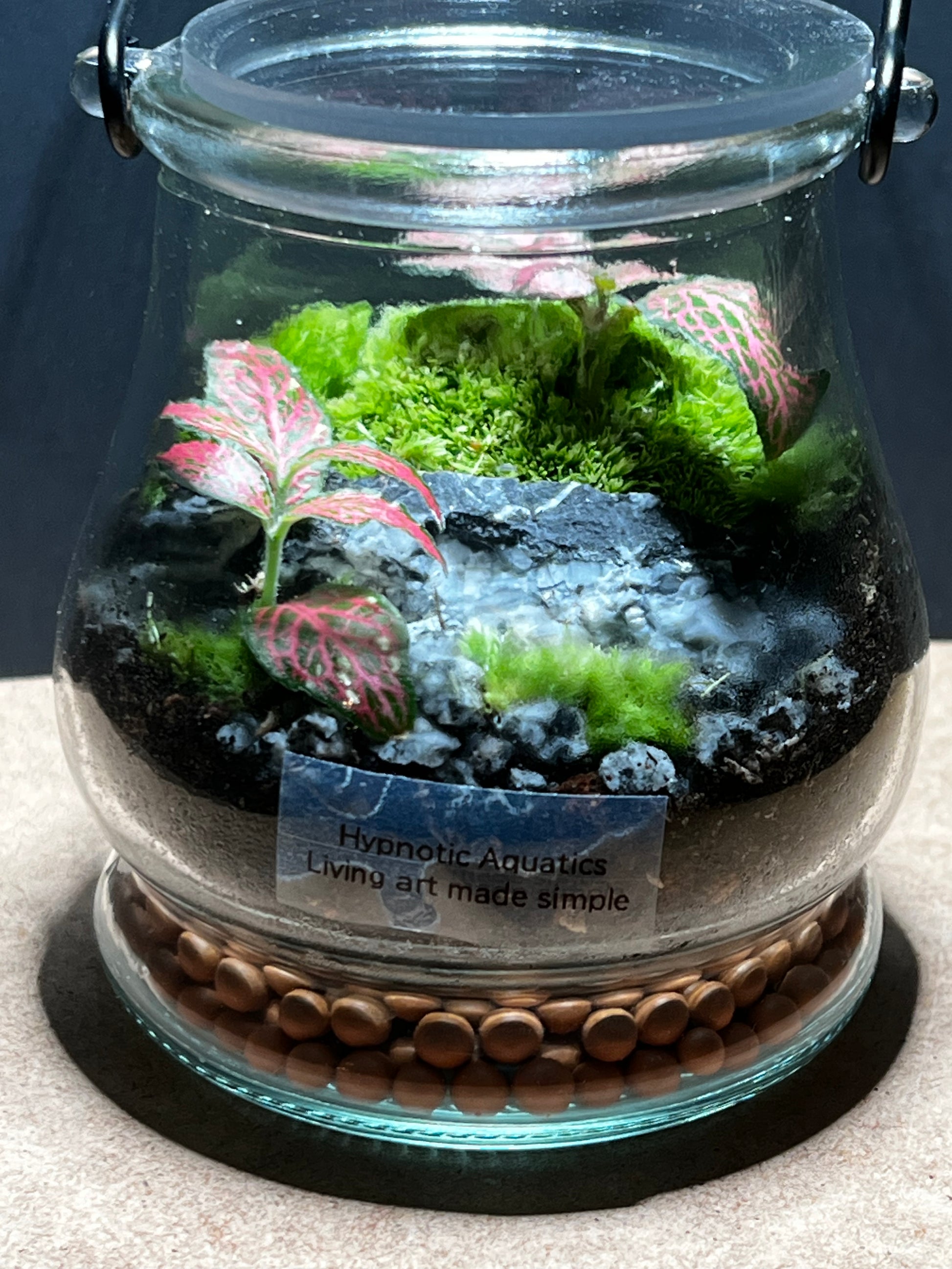 A small candle holder will work wonders as a terrarium. Pink Fittonia, Seiryu stone, Cushion Moss, and Bonsai stones all above our substrate blend.