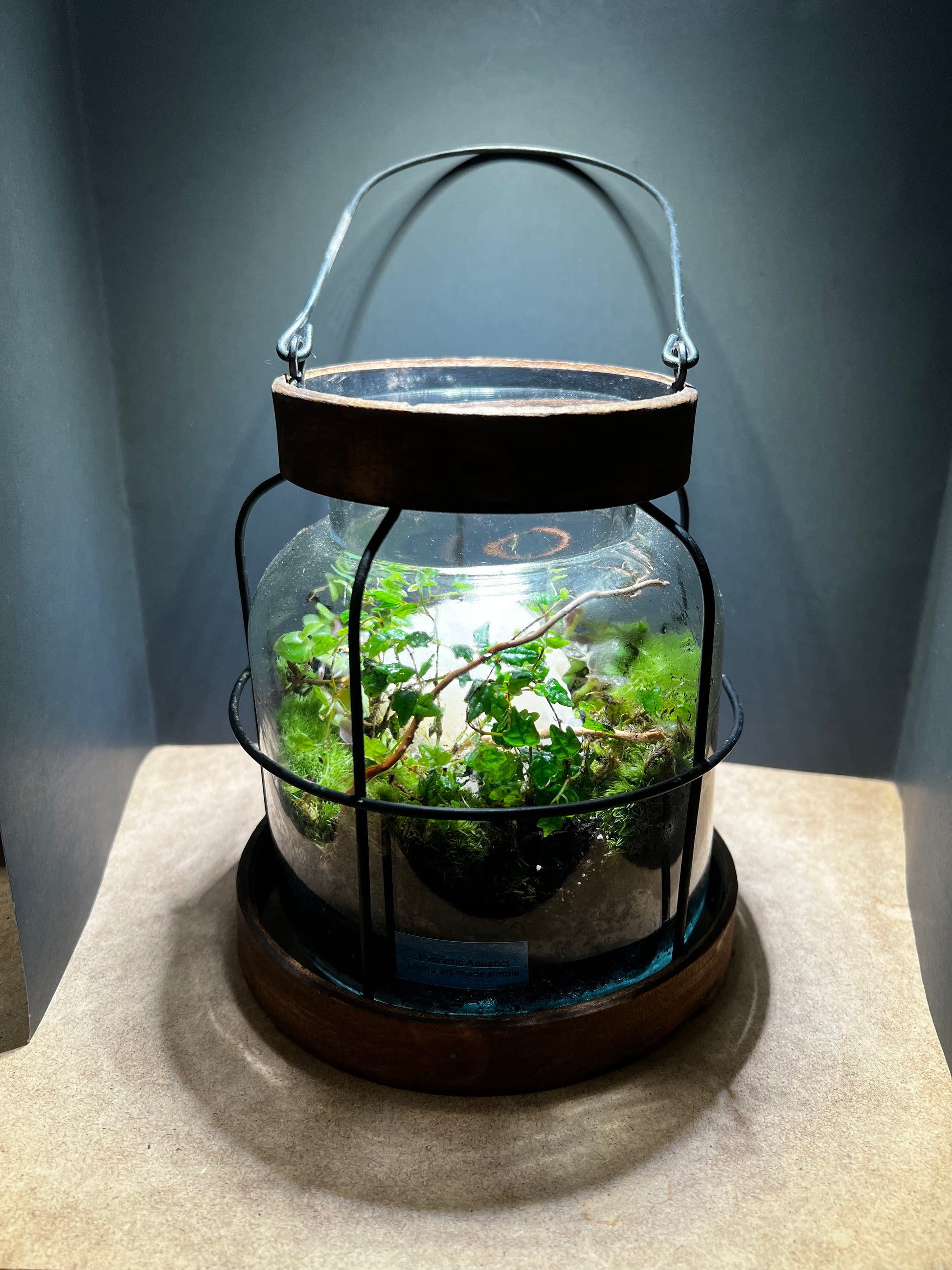 This vessel lights up my evenings, being a lantern is just a bonus. Cushion Moss, Turtle Vine, Flame Violet, Amber Quartz, String of Frogs, and Grape wood encompass this vessel.