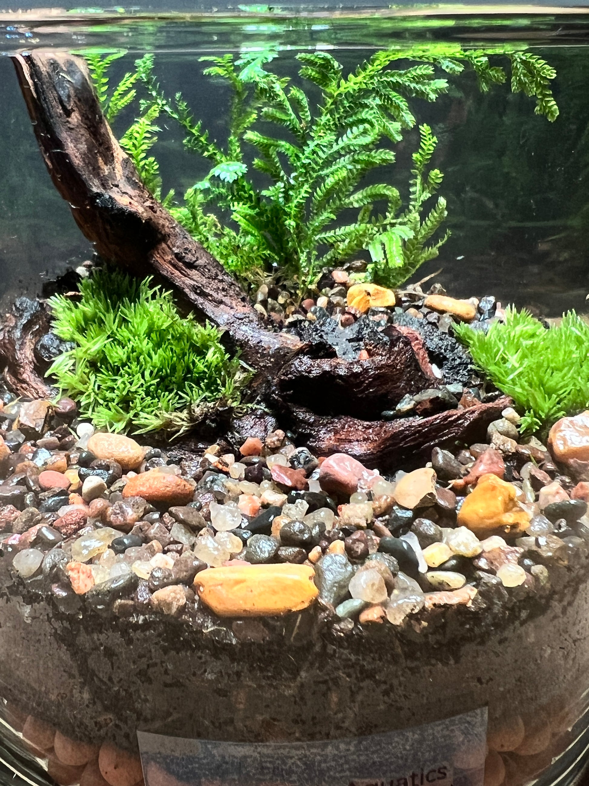 Giving you a new look, into a river basin or creek bed. Selaginella, Cushion Moss, Mopani wood, and Bonsai stones.