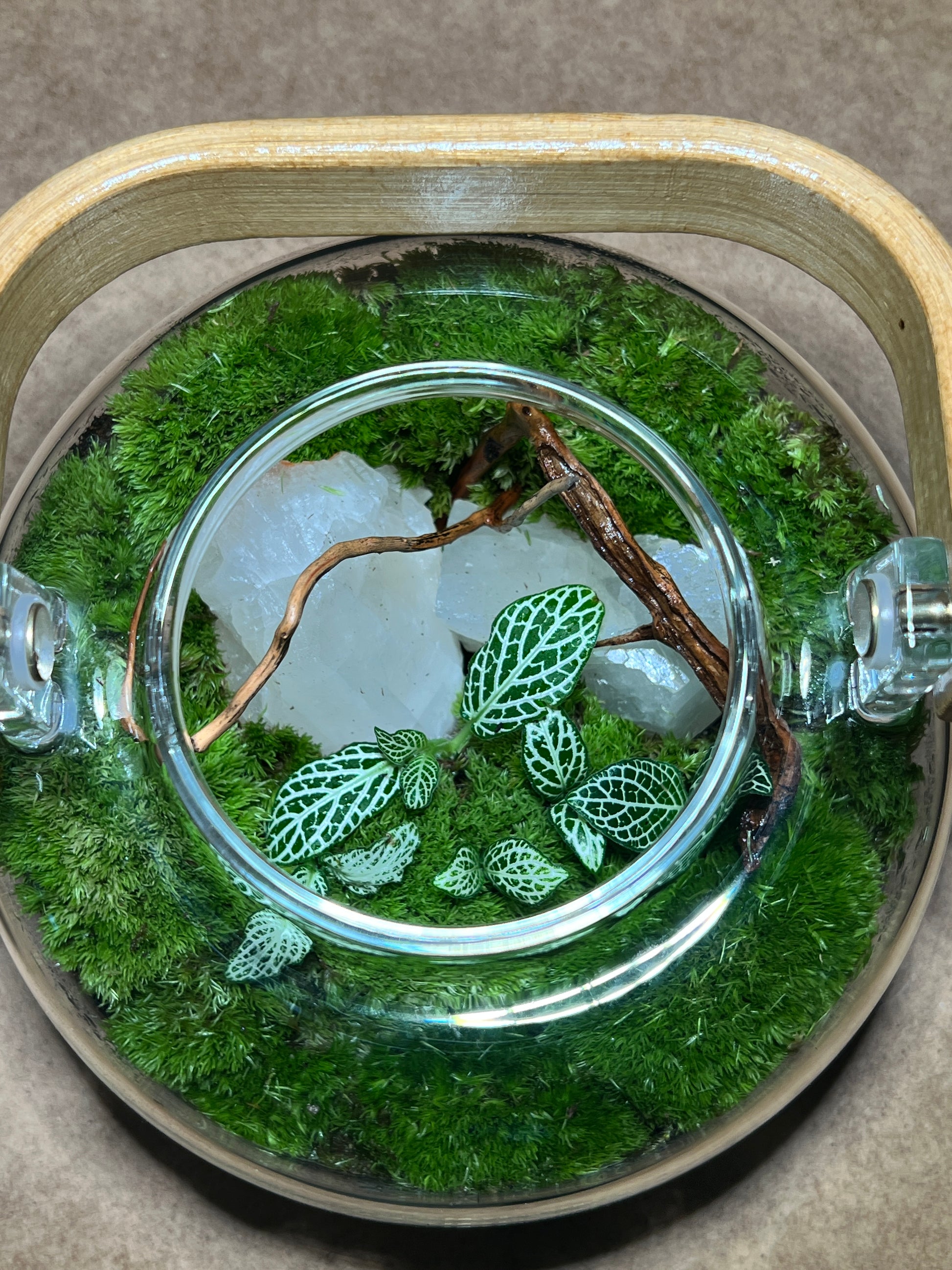 Tea pots for everyone! Our signature piece gets around so we keep creating more. White Fittonia, Amber Quartz, Drift wood, Cushion Moss, and our substrate blend below.