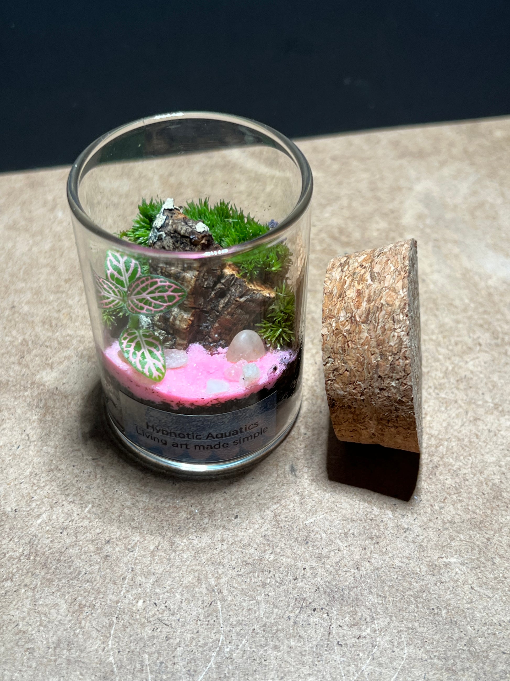 I can’t stop looking, it’s so cute. Pink Fittonia, Cushion Moss, Cork bark, Pink Aquarium sand, and our substrate blend below.