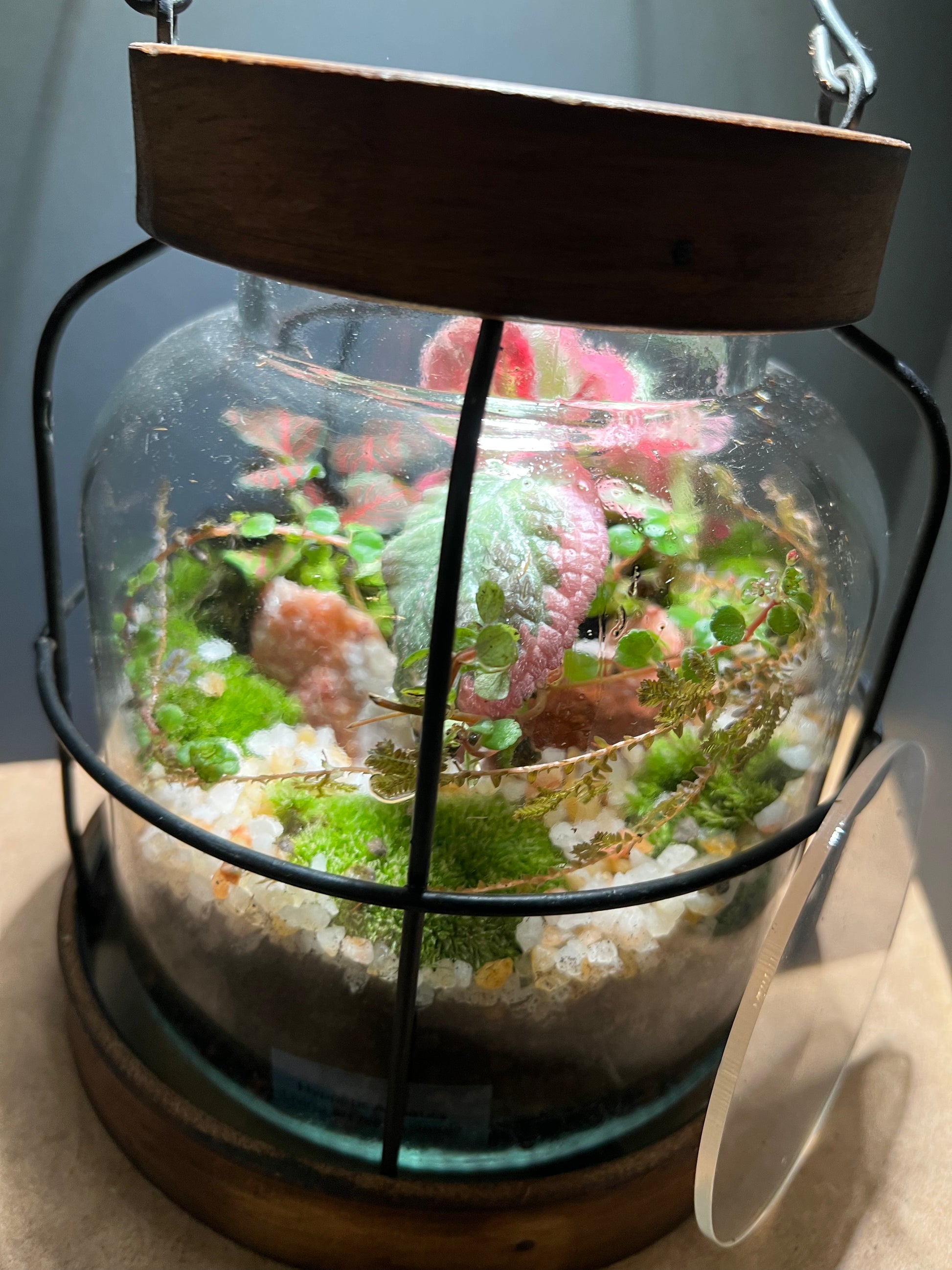 This Cleopatra Flame Violet sets the glass afire. Peacock Fern, Red stem tears, Pink Hybrid Fittonia, Cushion Moss, Natural River pebble and our substrate blend as base.