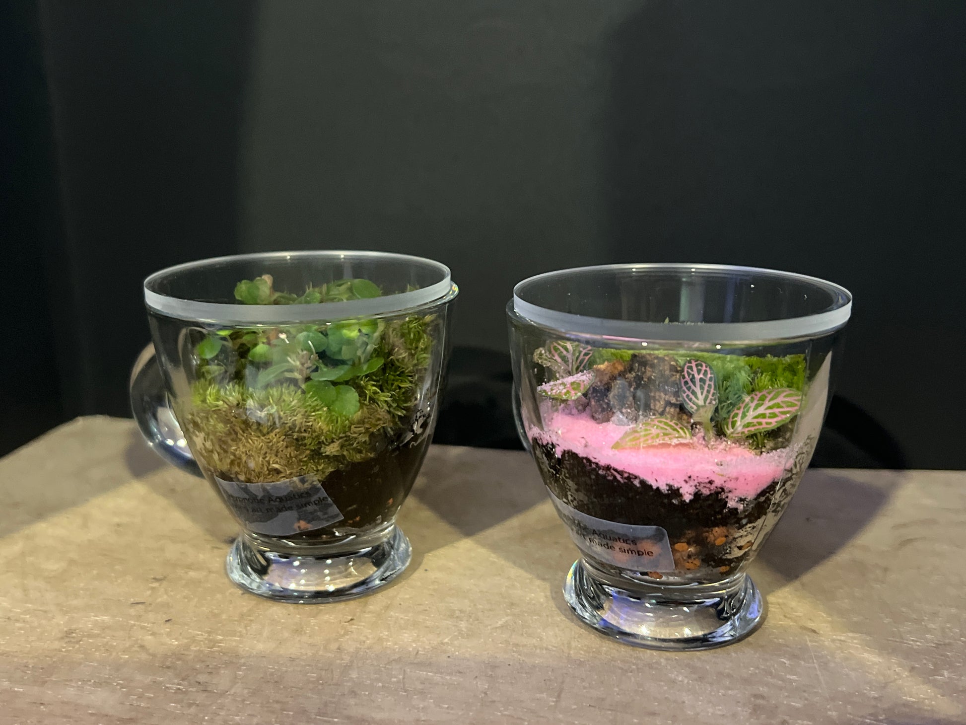 This seti (set of 2) tea cups is just adorable. Cup 1 contains Pink Fittonia, Cushion Moss, Cork bark, Pink aquatic sand and lid. Cup 2 contains Baby’s tears, Spider wood, Cushion Moss. Our substrate blend is base for both.