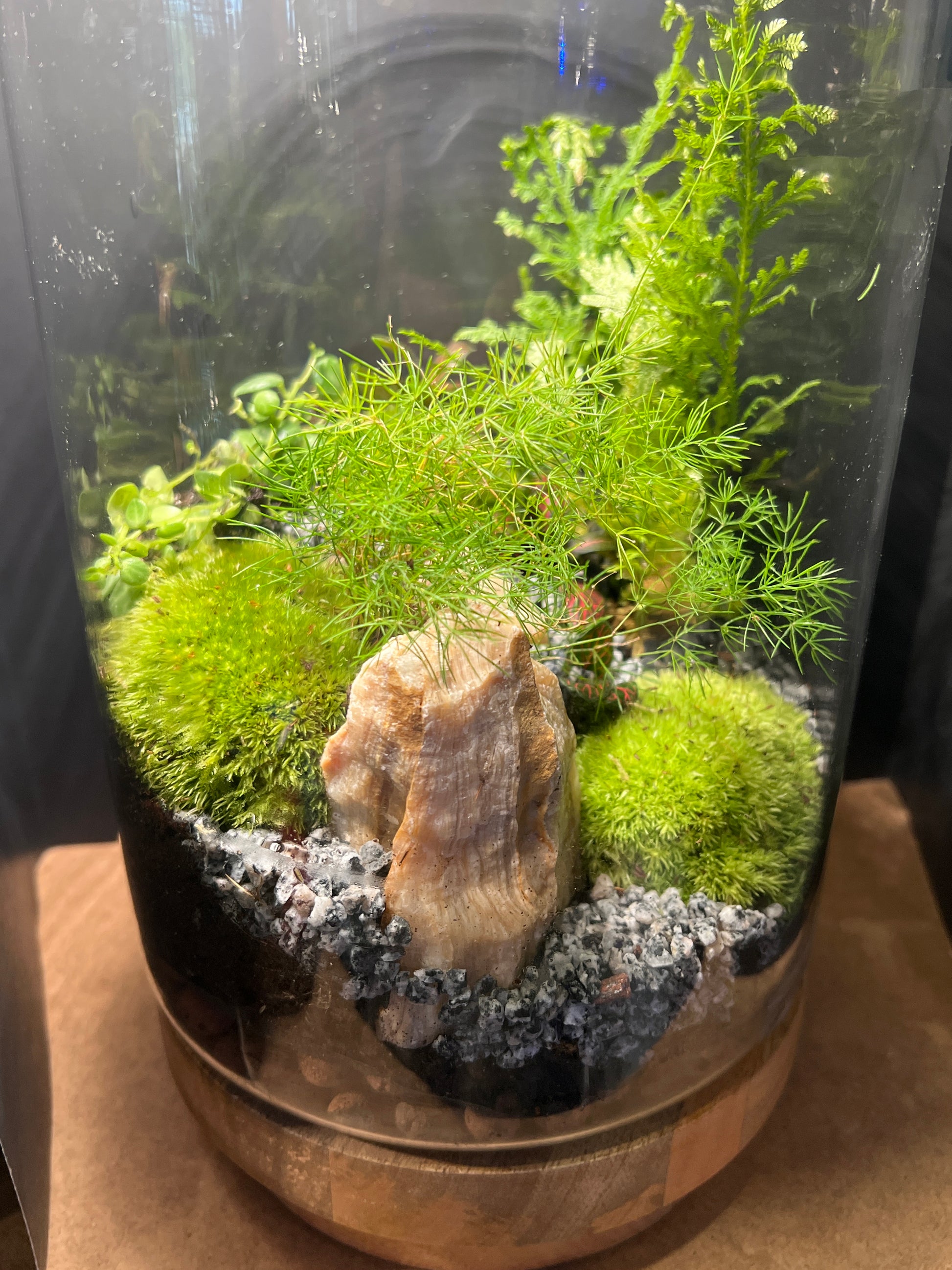 You wanted a statement piece, here it is, and it’s screaming take me home! Selaginella, Asparagus Fern, 3 Red Fittonia stacked in a row, String of Turtles, pockets of Cushion Moss all surrounded with Bonsai garden pebbles. Our tropical substrate blend is the base.