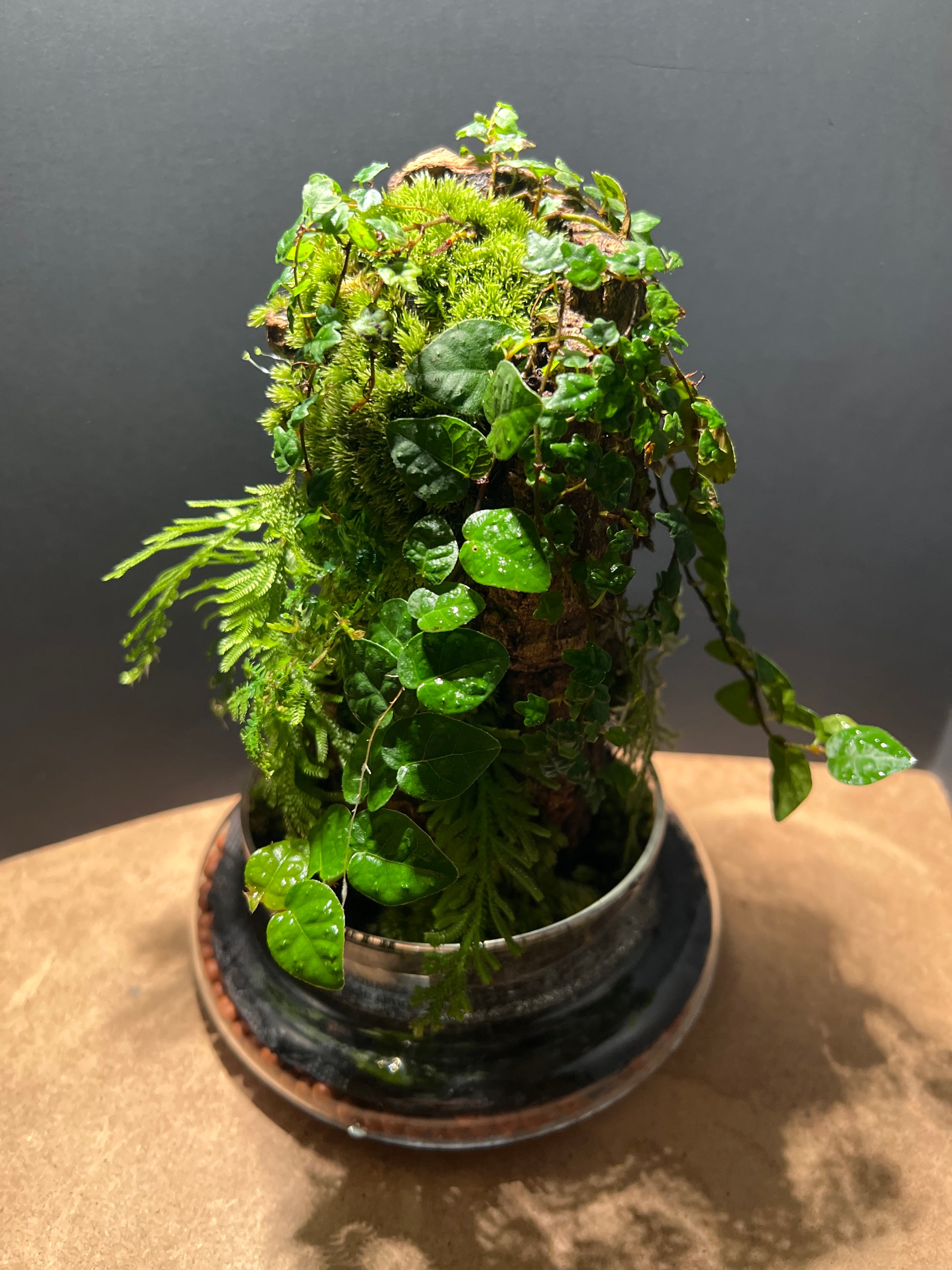 This unique and special terrarium is a Cloche, standing at 9” tall, which takes some special care to achieve long term growth. Contains, Selaginella, Creeping Fig, Cushion Moss, String of Frogs, all wrapped in a Cork Tube. Our smaller Leca, barrier, substrate blend is below.