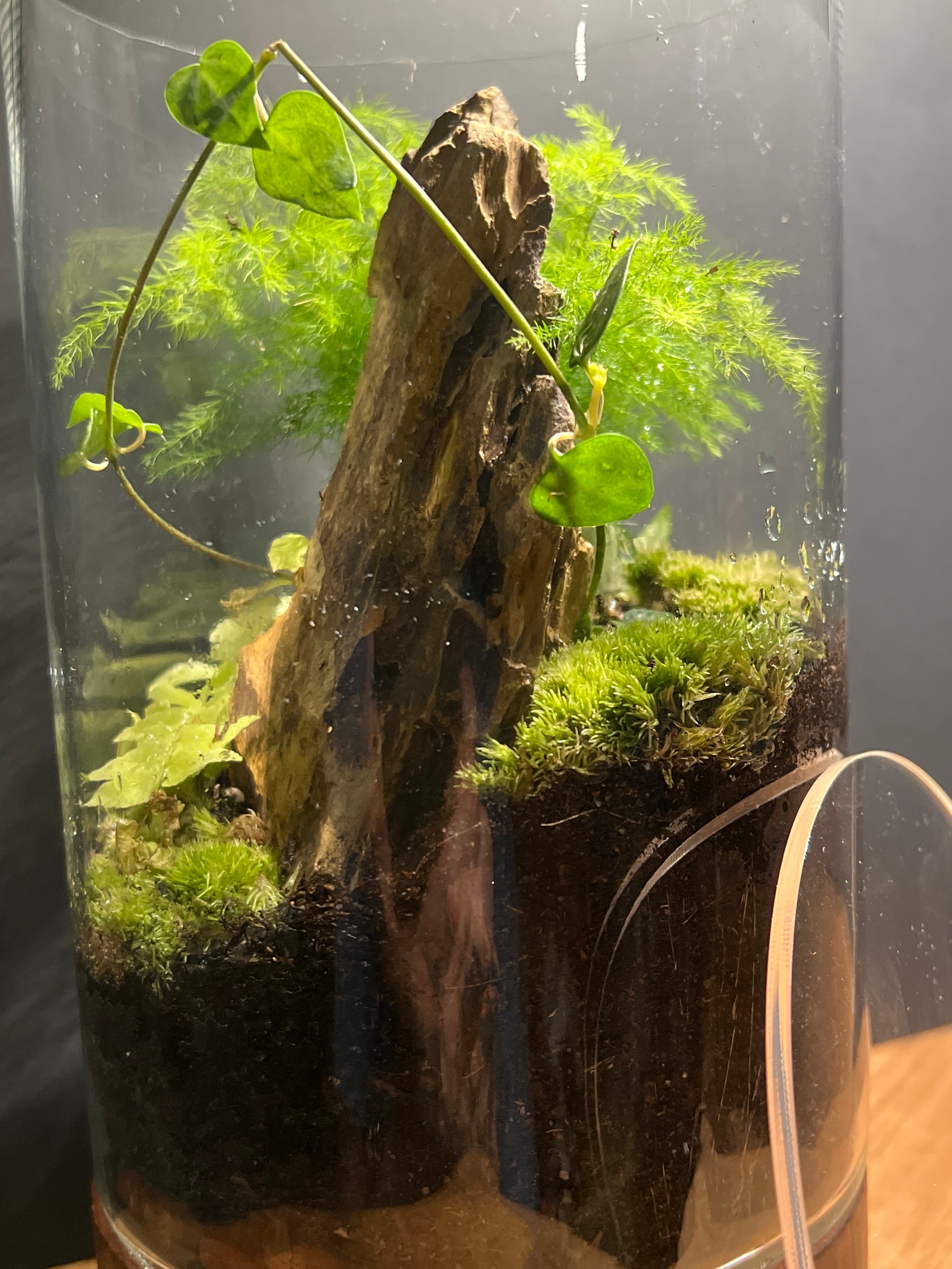 This beauty stands on a wood base and goes high with the Asparagus Fern Plumosa, String of Hearts, Golden Boston Fern, Cushion Moss, Dragon stone, and our tropical substrate blend.