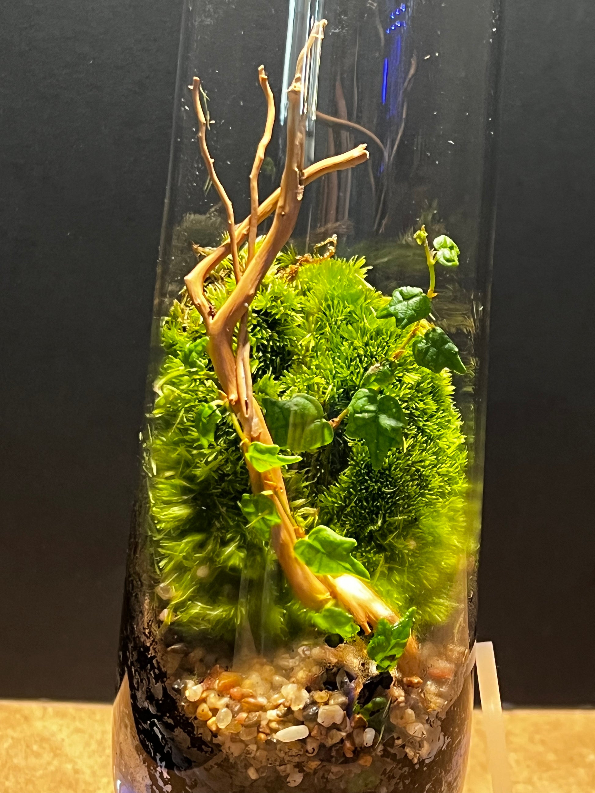 Another small vase with a big impact. String of Frogs, Cushion Moss, Fine dark aquatic pebble, Grape wood, and our substrate blend below.