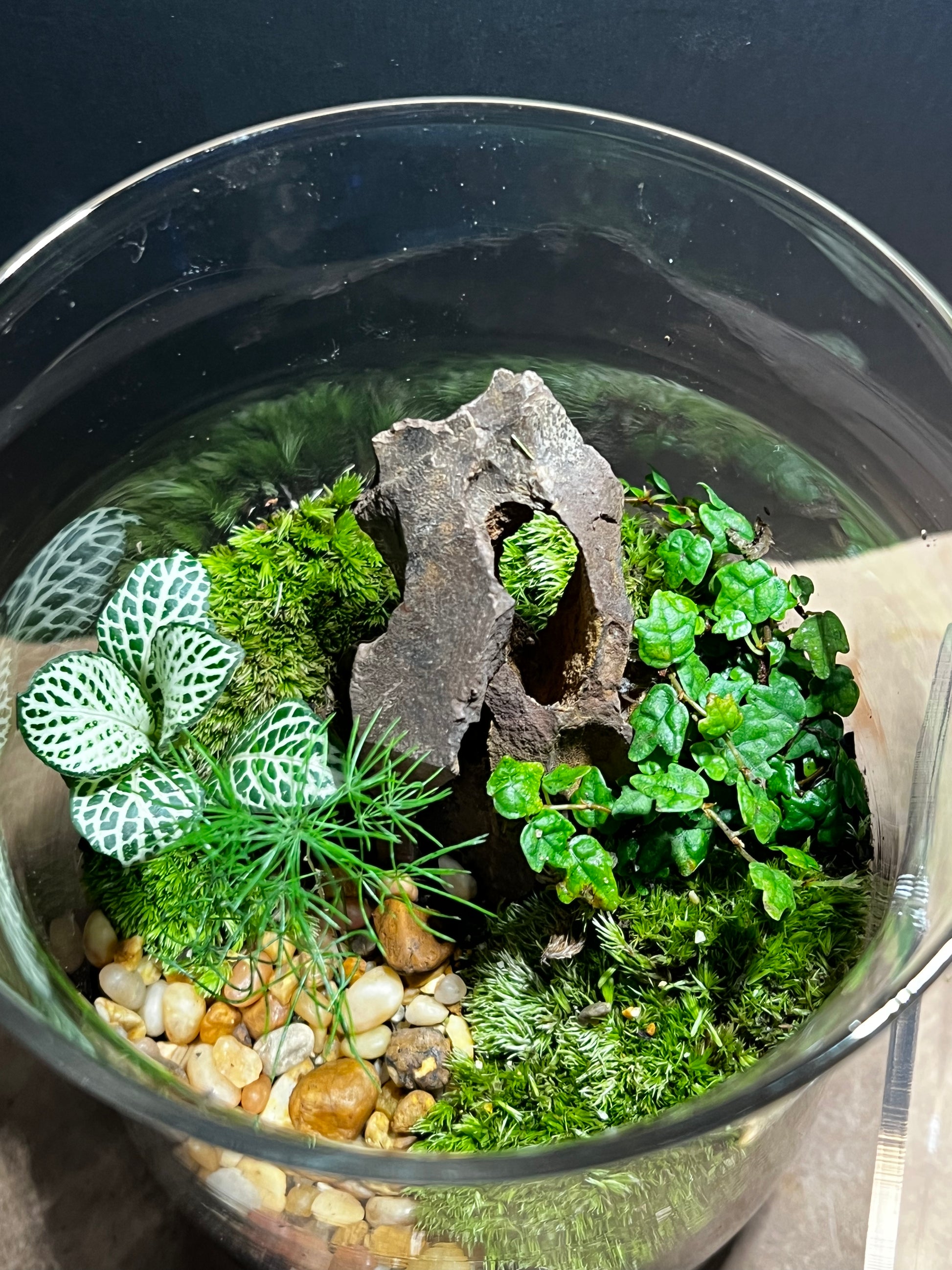 Moving up in size, we come to a 6.5” tall vessel filled with String of Frogs, Ming Asparagus Fern, White Fittonia, Cushion Moss, Dragon stone, Natural River pebble, and our substrate blend below.