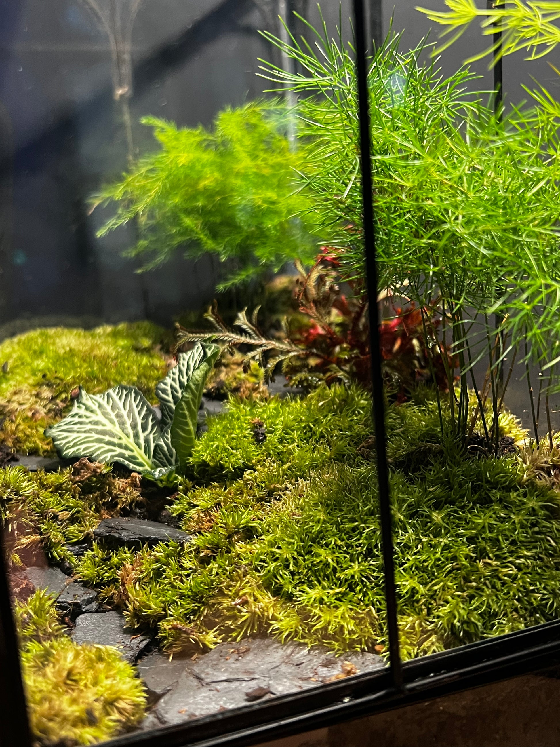 Who wants a greenhouse? I do! I do! Let’s start with the simplistic build of this vessel with Slate stones for a pathway thru, and pockets of Cushion Moss growing wild within. The Plumosa and Ming Asparagus Ferns sit outside the Ruby Red Selaginella, while a single Hybrid White Fittonia redirects the path.