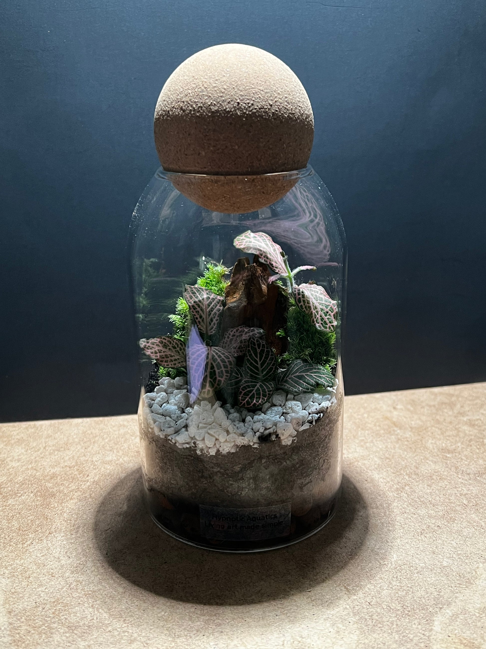 Taller but still on the small side, this vessel contains a garden of Pink Fittonia, Dragon stone, Cushion Moss, White aquatic gravel, and our substrate blend underneath.