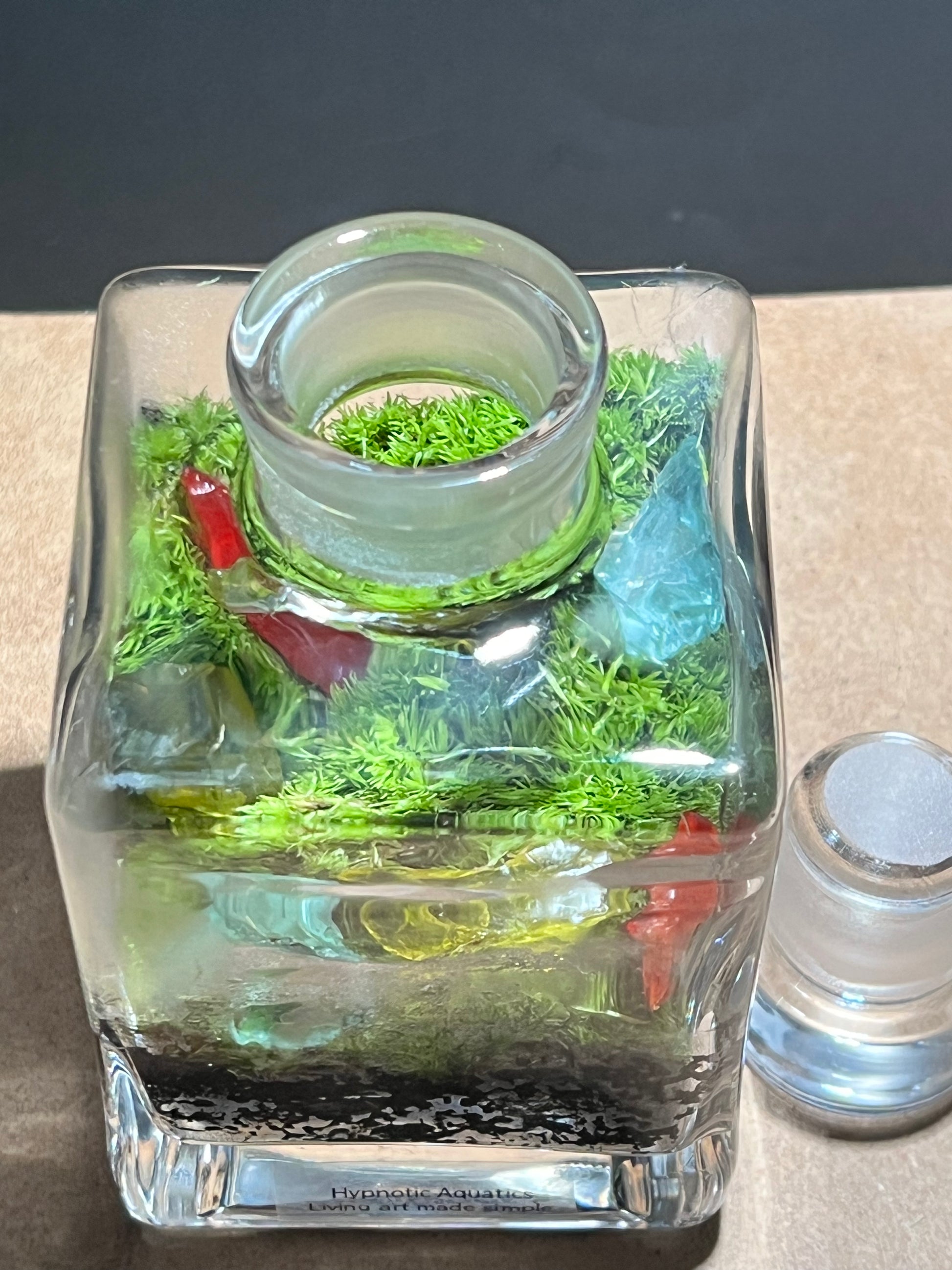 Can you believe the colors? My first glance I was blown away, no pun intended. Blue, Gold, Yellow, and Red Sea glass all on top of leca, tropical substrate blend, charcoal, and Cushion Moss.