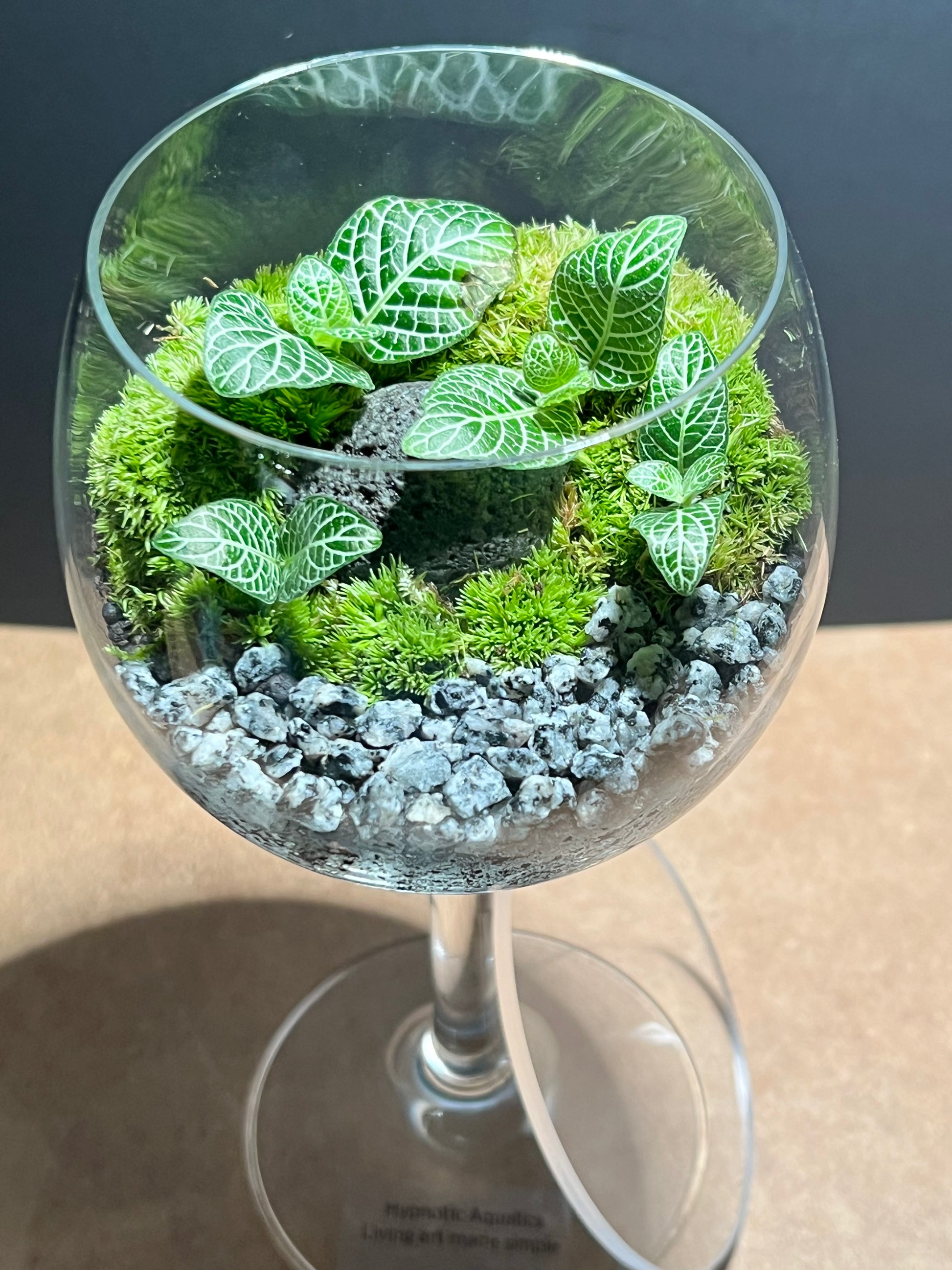 Let’s begin with a sip, then move on to what’s inside. White Fittonia, Cushion Moss, Lava rock, Bonsai pebble, our tropical substrate blend and leca below.