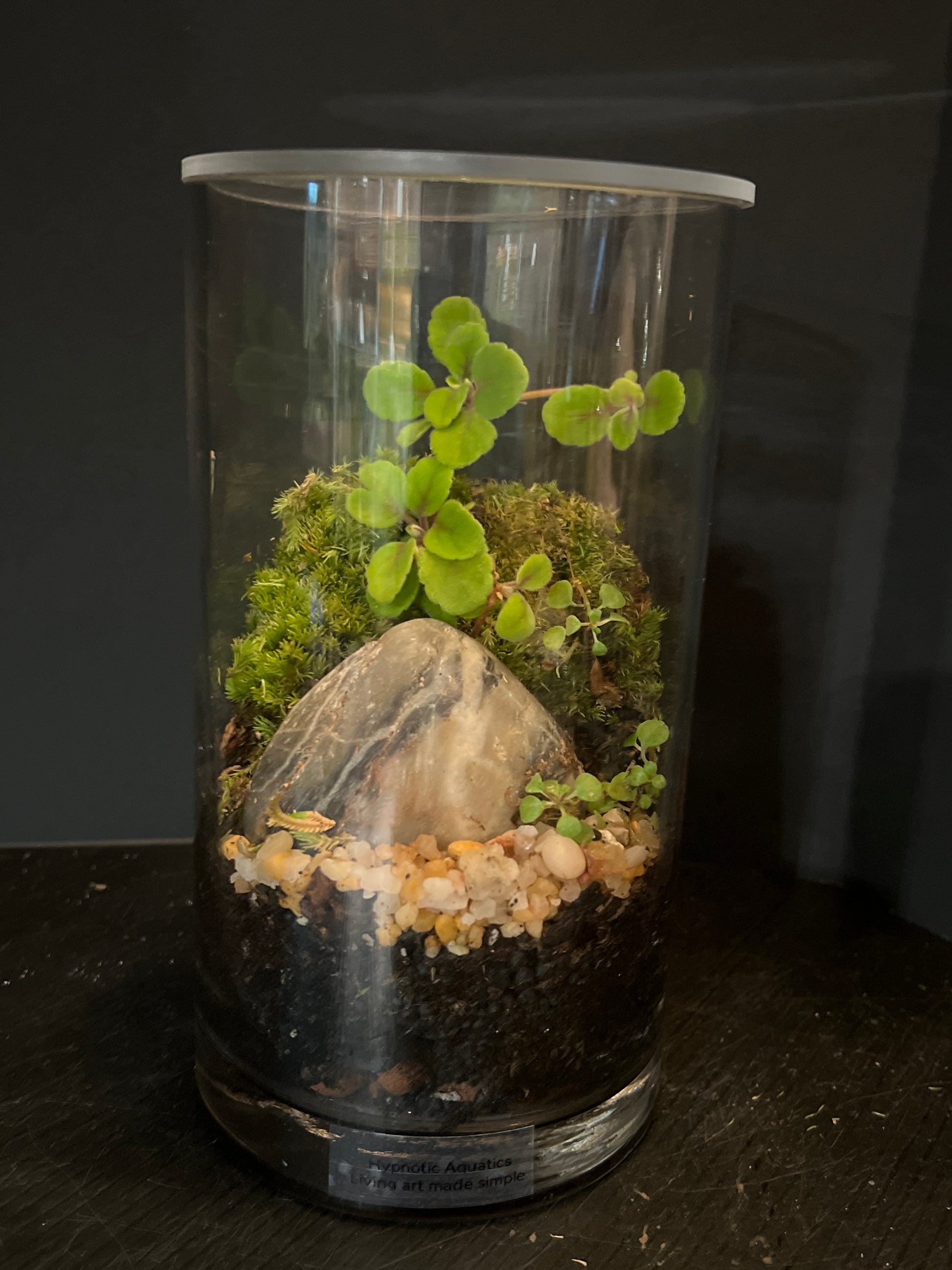 Standing just above 7” tall, this vessel is lush in green. Lace Flower Vine , Cushion Moss, Tiger’s Eye stone, Natural aquatic pebble, Baby’s tears, our substrate blend, with barrier and leca below.