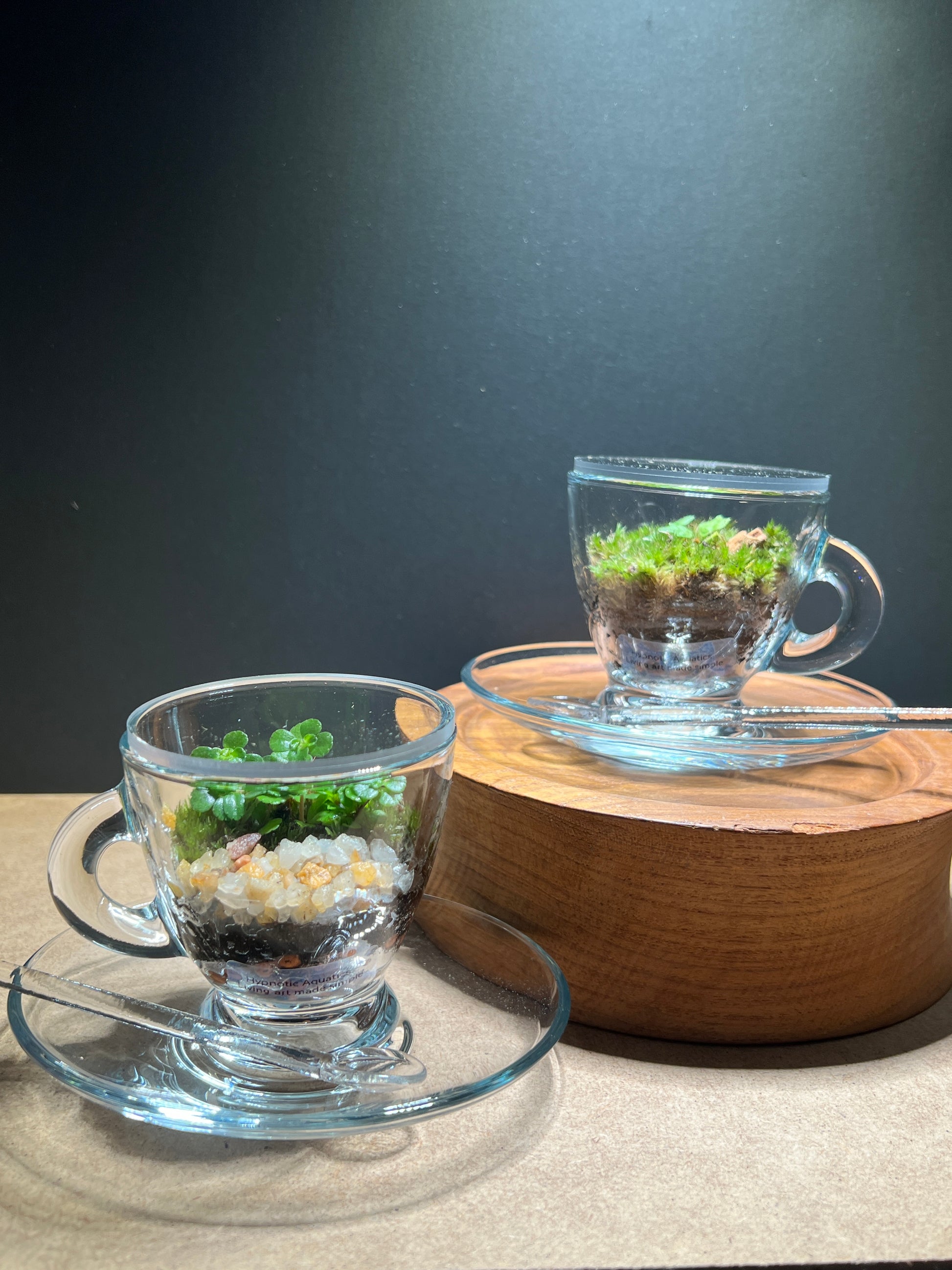 This set of two teacups contains Cushion Moss, Baby’s tears, String of Frogs, Small River pebbles and drift wood all above our tropical substrate blend.